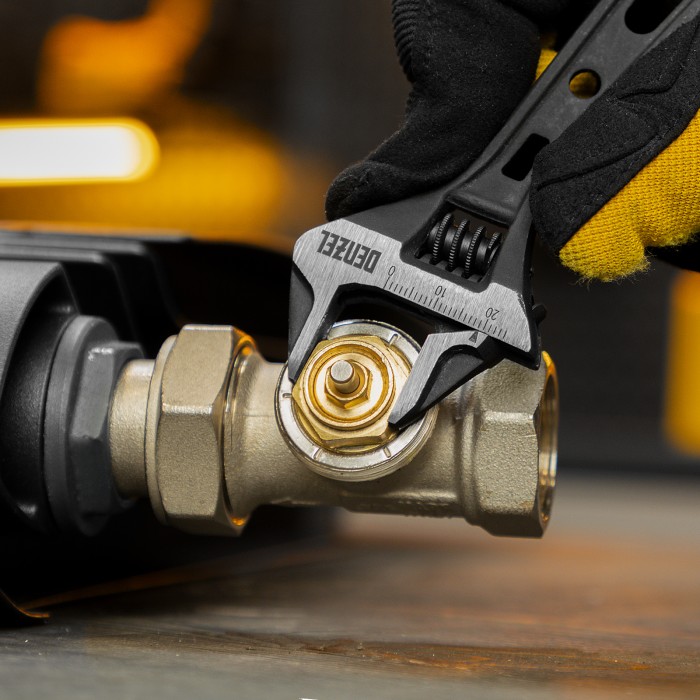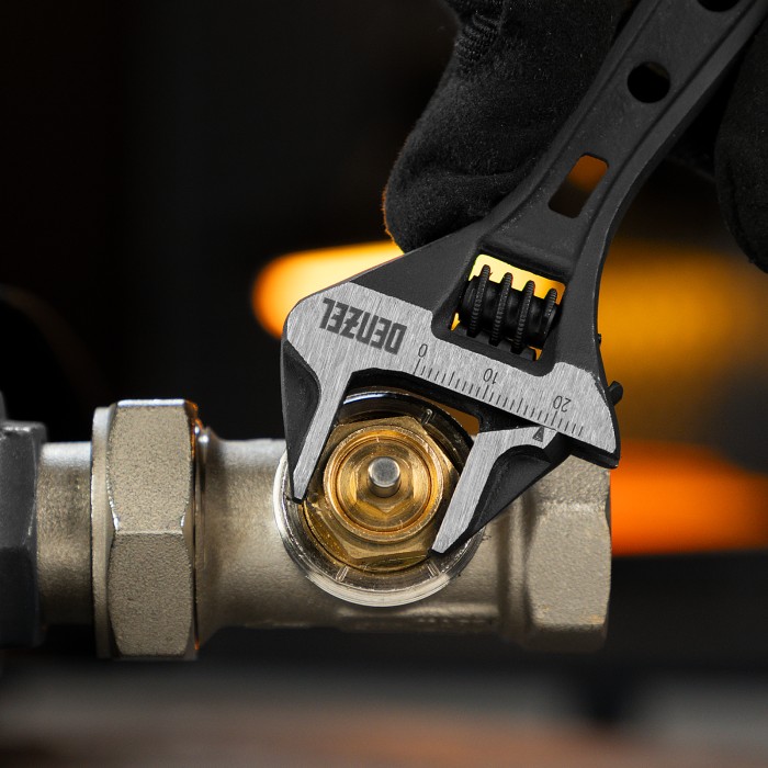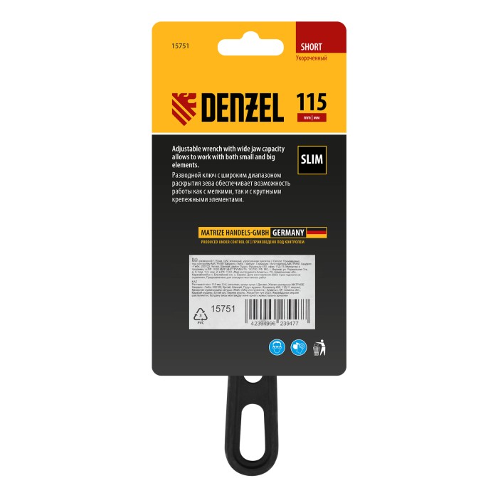 Ключ разводной кованый Denzel 15751 длиной 115 мм, из стали CrV, с укороченной рукояткой и увеличенным раскрытием губок, используется для монтажа и демонтажа крепежных элементов диаметром до 24 мм. Благодаря тонким губкам и укороченной рукоятке удобен для работы в труднодоступных местах. Имеет широкую область применения: сантехнические работы, мелкий бытовой ремонт, полупрофессиональная сфера и т. д.ПреимуществаПрочность и долговечность — ключ изготовлен из закаленной хромованадиевой стали методом ковки.Увеличенный ресурс — кованая конструкция усилена дополнительными ребрами жесткости на рукоятке. Защита от разрушения — фосфатированная поверхность инструмента не подвержена коррозии.Удобная эксплуатация — метрическая линейка на ключе помогает выставить нужный размах зева.Возможность подвесного хранения — в рукоятке предусмотрено специальное отверстие.