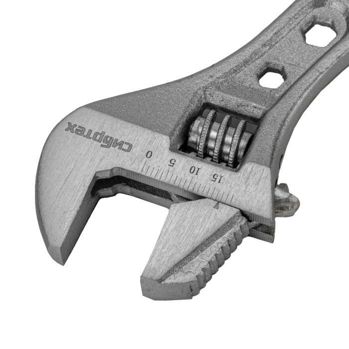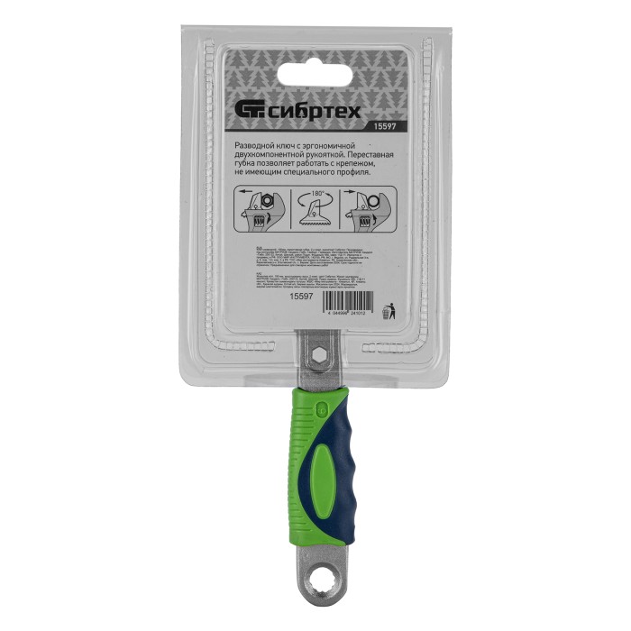 Разводной ключ Сибртех 15597 длиной 150 мм, с переставной губкой и двухкомпонентной рукояткой, предназначен для выполнения монтажных работ. Позволяет справляться с болтами разного размера и способен заменить целый арсенал гаечных ключей. Переставная губка с зазубринами позволяет использовать ключ для работы предметами без специального профиля, например, трубами.ПреимуществаПрочность и долговечность — ключ изготовлен из закаленной легированной стали, для надежной защиты от коррозии на инструмент нанесено никелевое покрытие.Функциональность — миллиметровая шкала и точечная риска позволяют разводить губки на точно заданное расстояние.Комфортная работа — двухкомпонентная рукоятка с рифлением и подпальцевыми выемками не выскальзывает из ладони.Малый вес 0,18 кг — нагрузка на руку снижена, что позволяет долго работать без усталости.