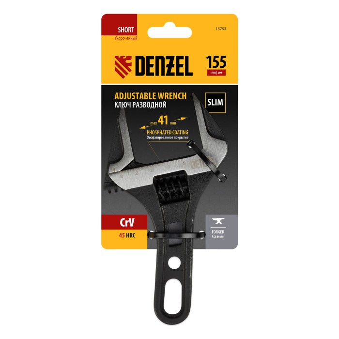 Ключ разводной 155 мм, CrV, кованый, укороченная рукоятка Denzel