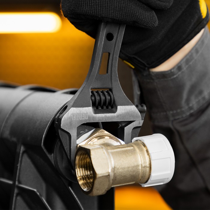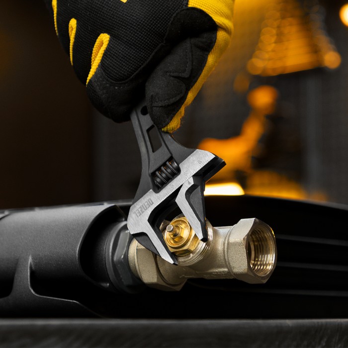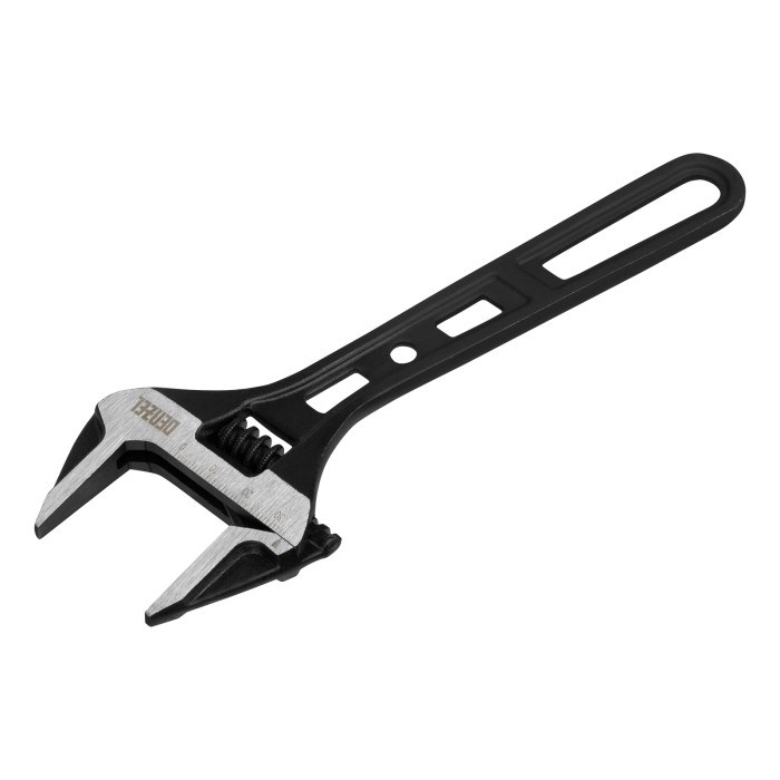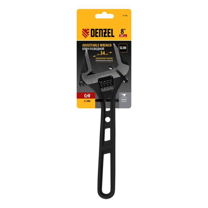 Ключ разводной кованый Denzel 15748 длиной 200 мм, из стали CrV, используется для монтажа и демонтажа крепежных элементов диаметром до 34 мм. Благодаря тонким губкам удобен для работы в труднодоступных местах. Имеет широкую область применения: сантехнические работы, мелкий бытовой ремонт, полупрофессиональная сфера и т. д.ПреимуществаПрочность и долговечность — ключ изготовлен из закаленной хромованадиевой стали методом ковки.Увеличенный ресурс — кованая конструкция усилена дополнительными ребрами жесткости на рукоятке. Защита от разрушения — фосфатированная поверхность инструмента не подвержена коррозии.Удобная эксплуатация — метрическая линейка на ключе помогает выставить нужный размах зева.Возможность подвесного хранения — в рукоятке предусмотрено специальное отверстие.