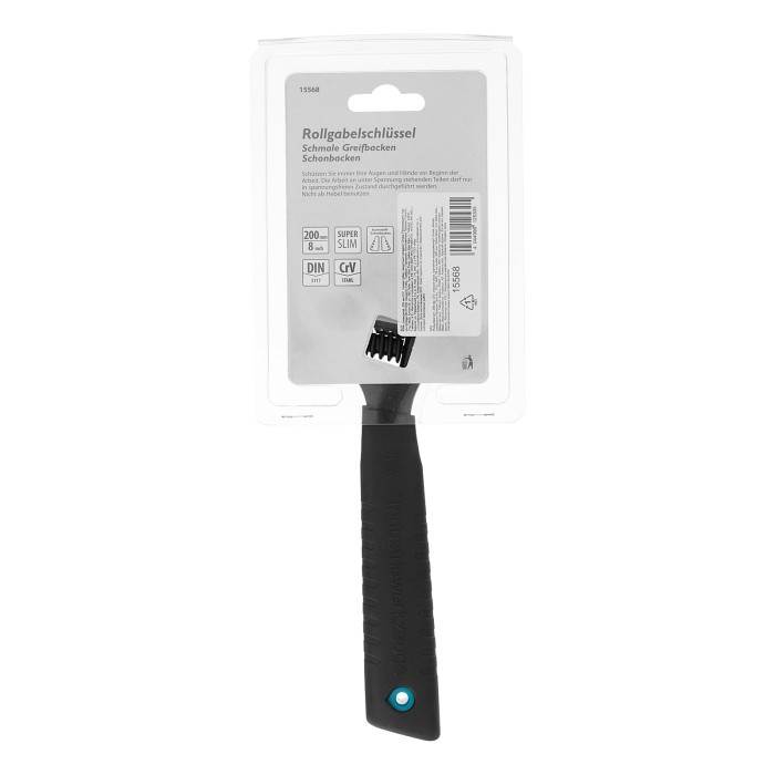 Разводной ключ Gross 15568 из стали CrV, длиной 200 мм, с тонкими губками и защитными насадками, обеспечивает ширину раскрытия губок на 30% больше, чем у стандартных моделей. Инструмент подходит для монтажа и демонтажа крепежных элементов диаметром до 40 мм. Применяется для сантехнических работ, ремонта автомобилей, решения бытовых задач. Тонкие губки легко проникают в труднодоступные места, а также удобны для захвата мелких деталей.ПреимуществаПрочность и долговечность — ключ изготовлен из высококачественной хромованадиевой стали, а фосфатное покрытие защищает его от коррозии.Защита губок — пластиковые насадки предотвращают повреждение хромированных поверхностей.Точная регулировка — метрическая линейка на ключе позволяет установить нужную величину раскрытия губок.Облегченный корпус — длительная работа с ключом не вызывает усталость.Комфортная работа — удобная рукоятка обеспечивает надежный хват и позволяет прикладывать больше усилий во время работы.Удобное хранение — в рукоятке предусмотрено отверстие для подвешивания.