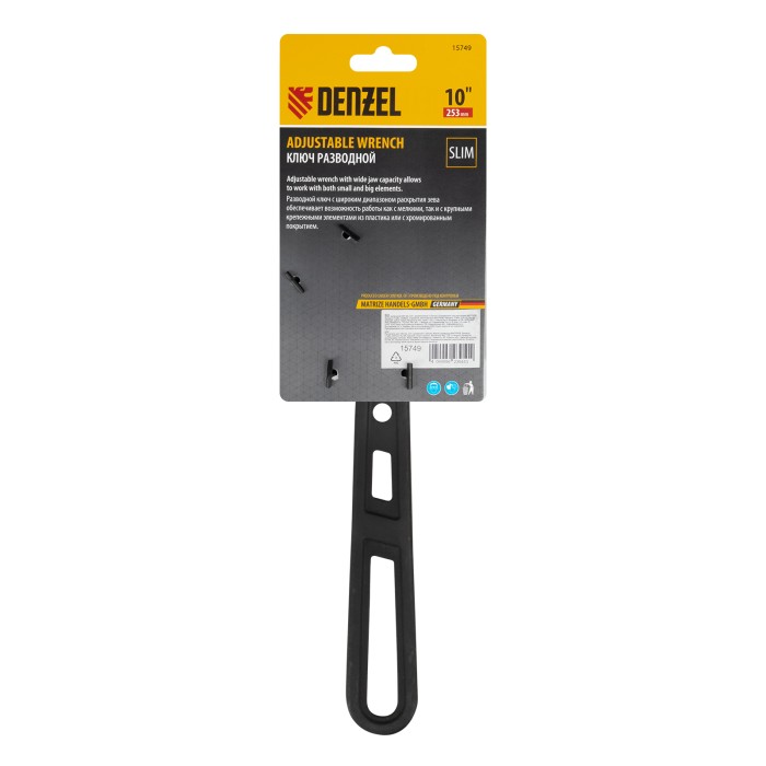 Ключ разводной кованый Denzel 15749 длиной 250 мм, из стали CrV, используется для монтажа и демонтажа крепежных элементов диаметром до 41 мм. Благодаря тонким губкам удобен для работы в труднодоступных местах. Имеет широкую область применения: сантехнические работы, мелкий бытовой ремонт, полупрофессиональная сфера и т. д.ПреимуществаПрочность и долговечность — ключ изготовлен из закаленной хромованадиевой стали методом ковки.Увеличенный ресурс — кованая конструкция усилена дополнительными ребрами жесткости на рукоятке. Защита от разрушения — фосфатированная поверхность инструмента не подвержена коррозии.Удобная эксплуатация — метрическая линейка на ключе помогает выставить нужный размах зева.Возможность подвесного хранения — в рукоятке предусмотрено специальное отверстие.