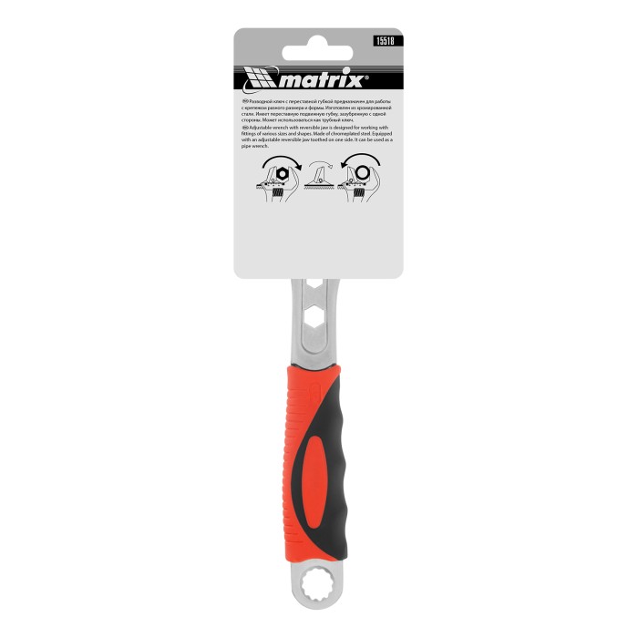Разводной ключ Matrix 15518 длиной 250 мм, с переставной губкой и двухкомпонентной рукояткой, предназначен для выполнения монтажных работ. Способен заменить целый арсенал гаечных ключей, поскольку справляется с болтами разного размера. Переставная губка с зазубринами позволяет использовать ключ для работы предметами без специального профиля, например, трубами.ПреимуществаВысокая прочность — инструмент изготовлен из износостойкой хромованадиевой стали 40 CRV.Коррозионная стойкость — хромовое покрытие защищает ключ от разрушения под воздействием влаги.Функциональность — градуировка и точечная риска позволяют разводить губки на точно заданное расстояние.Комфортная работа — двухкомпонентная рукоятка с рифлением и подпальцевыми выемками не выскальзывает из ладони.