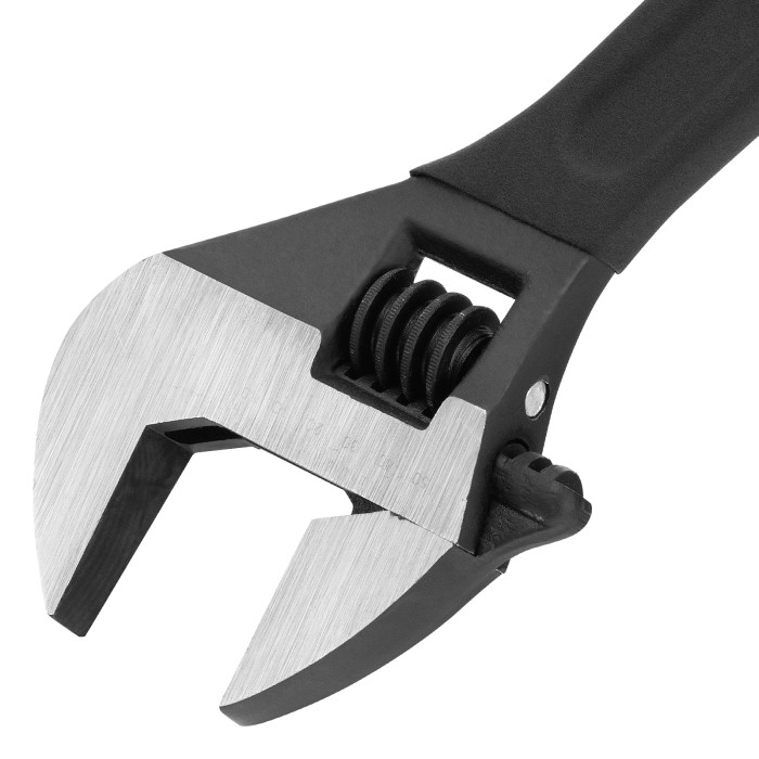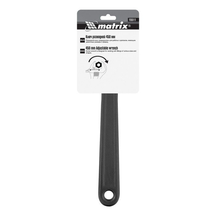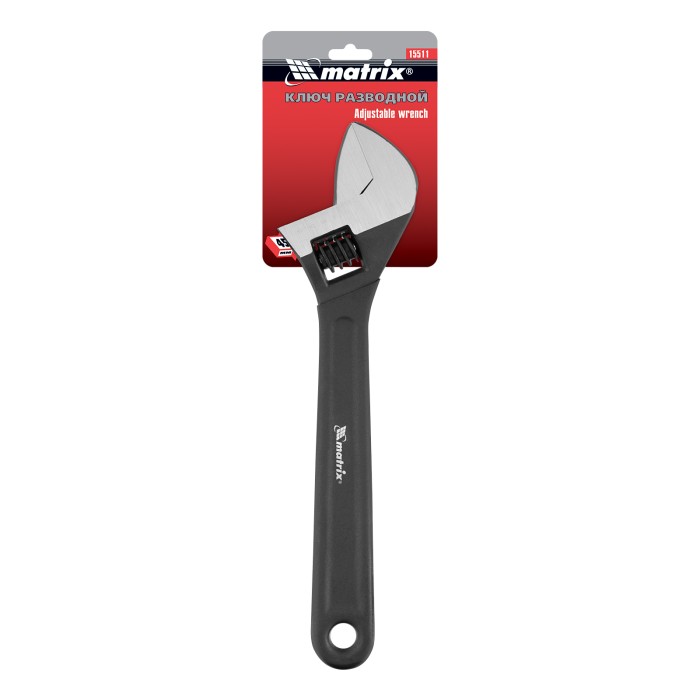 Разводной ключ Matrix 15511 длиной 450 мм используется для монтажа и демонтажа крепежных элементов. Заменяет собой целый комплект обычных гаечных ключей. Губки можно разводить на точно заданное расстояние, что позволяет захватывать детали различного размера. Разводной ключ пригодится для проведения слесарных, сантехнических, ремонтных работ.ПреимуществаПрочность — ключ изготовлен из высококачественной углеродистой стали 45 и прошел селективную закалку.Коррозионная стойкость — фосфатное покрытие защищает червячный винтовой механизм от воздействия влаги.Точность выполняемых работ — на губках имеется градуировка и точечная риска.Эргономичность — обливная рукоятка удобно ложится в руку и имеет отверстие для подвесного хранения.