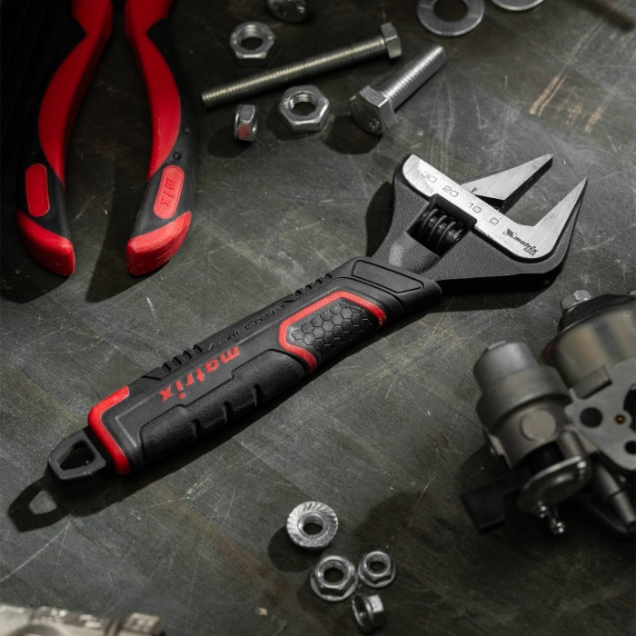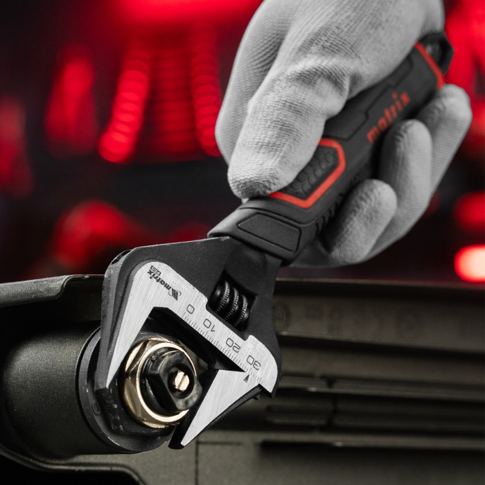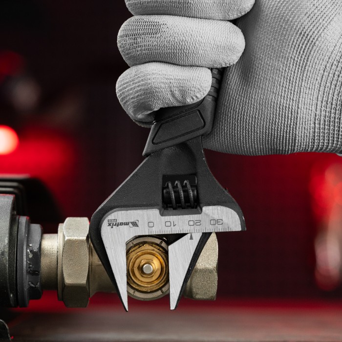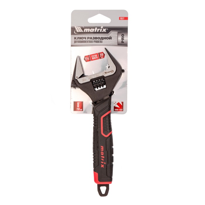 Фосфатированный разводной ключ Matrix PRO 15577 длиной 200 мм, с тонкими губками и двухкомпонентной рукояткой, — профессиональный инструмент, применяется для монтажа и демонтажа крепежных элементов и работы с узкими фити...