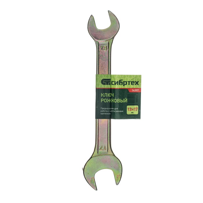 Рожковый ключ Сибртех 14307 с покрытием из желтого цинка имеет две рабочие части с размером зева 13 и 17 мм и предназначен для закручивания и откручивания резьбовых крепежей с шестигранными головками. Губки расположены п...