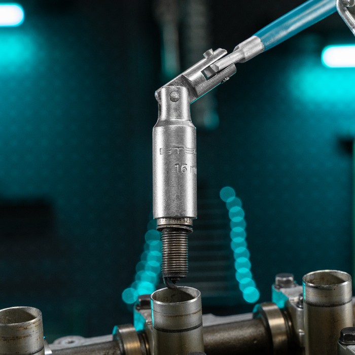 Свечной карданный ключ Stels 13841 размером 16 х 250 мм применяется для замены свечей зажигания в автомобиле. Он подойдет автолюбителям, частным и профессиональным мастерам для использования в гараже или на СТО. Двойной карданный механизм позволяет с удобством работать в труднодоступных местах. Резиновый фиксатор на ключе обеспечивает надежное удержание свечей.ПреимуществаПри изготовлении ключа используется сталь 45, это гарантирует его высокий ресурс.Ключ оцинкован, таким образом достигается антикоррозийная защита.Обрезиненная рукоятка не выскальзывает из рук, это обеспечивает надежный хват и удобство работы.