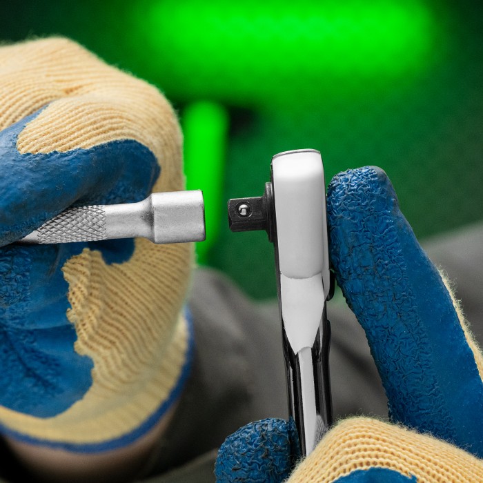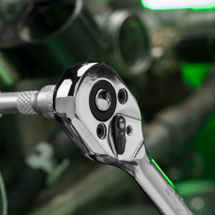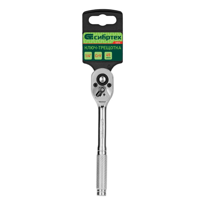 Цельнометаллический хромированный ключ-трещотка Сибртех 14014 из стали CrV, с посадочным размером 1/4″ и 45-зубым храповым механизмом, с функцией быстрого сброса, используется для монтажа и демонтажа резьбовых соединений...