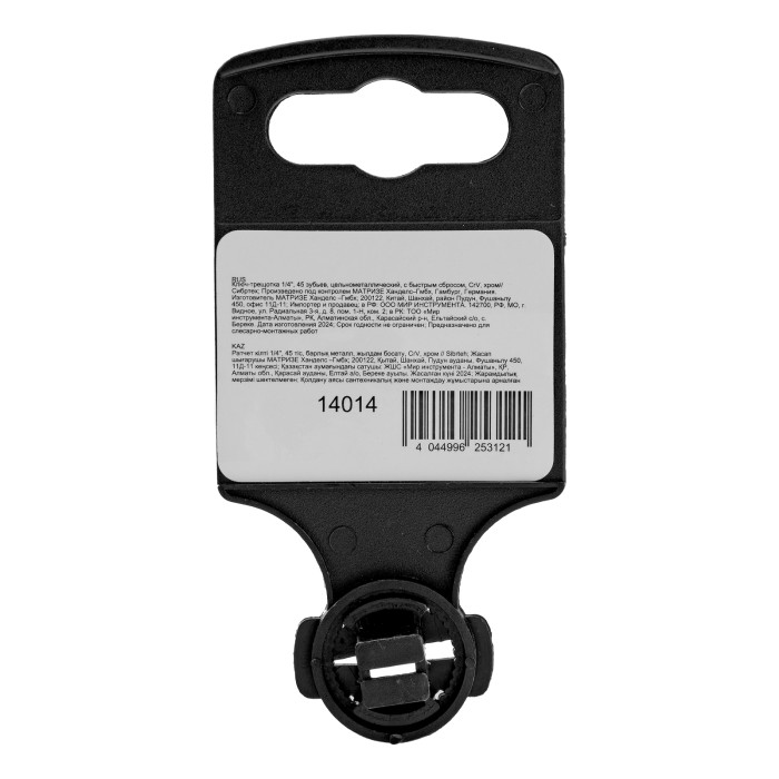 Цельнометаллический хромированный ключ-трещотка Сибртех 14014 из стали CrV, с посадочным размером 1/4″ и 45-зубым храповым механизмом, с функцией быстрого сброса, используется для монтажа и демонтажа резьбовых соединений. Предназначен для установки торцевых головок, адаптеров и удлинителей. Цельнометаллическая конструкция отличается повышенной прочностью, что позволяет работать со значительным усилием. Инструмент пригодится дома, в гараже и в поездке.ПреимуществаПрочность — ключ изготовлен из закаленной хромованадиевой стали и выдерживает высокие нагрузки.Долговечность — хромированная поверхность устойчива к образованию коррозии.Функция реверса — при помощи переключателя с металлическим флажком можно одним движением изменить направление вращения трещотки.Надежная фиксация — шариковый замок крепко удерживает торцевую головку, поэтому она не соскочит во время работы.Быстрый сброс — достаточно нажать на кнопку, чтобы освободить головку от насадки, это особенно удобно для работы с крепежом разного размера.