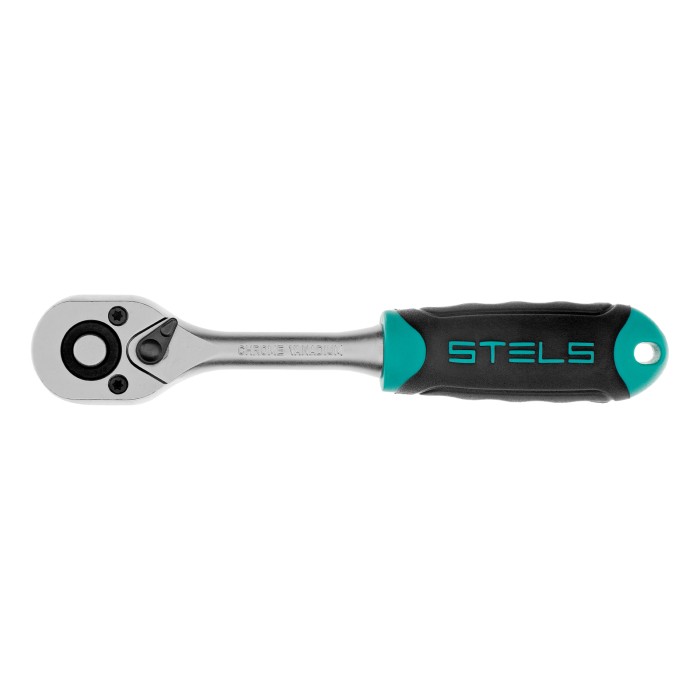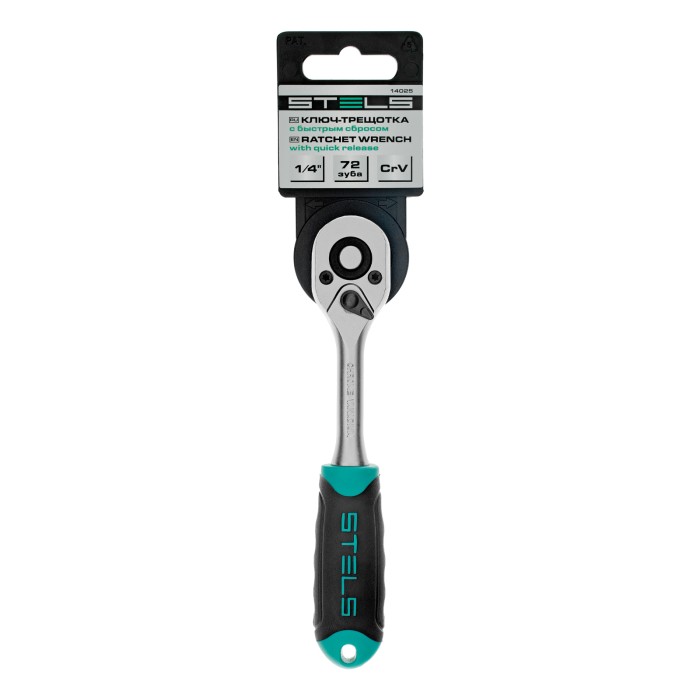 Ключ-трещотка Stels 14025 из стали CrV, с присоединительным квадратом 1/4", 72 зубцами и быстрым сбросом, предназначен для работы с резьбовым крепежом. Совместим с торцевыми головками различных размеров, а также адаптерами и удлинителями. Инструмент работает мягко и плавно благодаря 72-зубому храповому механизму. Шаг трещотки составляет 5°, что облегчает работу в ограниченном пространстве. Инструмент будет полезен в сервисном центре, авторемонтной мастерской, а также пригодится дома, в гараже или на даче.ПреимуществаУстойчивость к нагрузкам — ключ изготовлен из высокопрочной хромованадиевой стали.Защита от коррозии — инструмент хромирован.Шариковый фиксатор — торцевые головки и другие насадки не соскакивают во время работы.Легкая замена насадок — конструкцией предусмотрен механизмом быстрого сброса.Реверс — флажковый переключатель позволяет мгновенно изменить направление вращения насадки.Удобная эксплуатация — двухкомпонентная рукоятка не выскальзывает из руки, а ее эргономичная форма способствует снижению усталости при длительной работе.