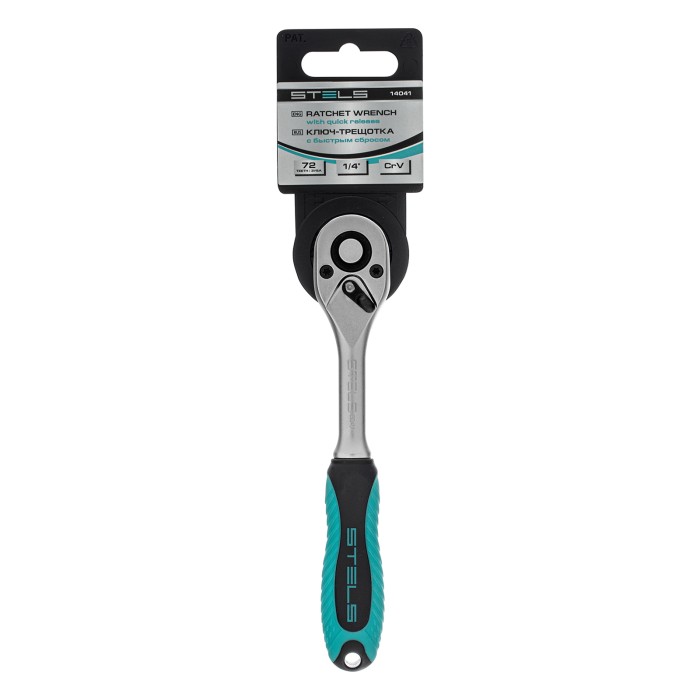Ключ-трещотка Stels 14041 из стали CrV, с присоединительным квадратом 1/4", 72 зубцами и быстрым сбросом, предназначен для работы с резьбовым крепежом. Совместим с торцевыми головками различных размеров, а также адаптерами и удлинителями. Инструмент работает мягко и плавно благодаря 72-зубому храповому механизму. Шаг трещотки составляет 5°, что облегчает работу в ограниченном пространстве. Инструмент будет полезен в сервисном центре, авторемонтной мастерской, а также пригодится дома, в гараже или на даче.ПреимуществаУстойчивость к нагрузкам — ключ изготовлен из высокопрочной хромованадиевой стали.Защита от коррозии — инструмент хромирован.Шариковый фиксатор — торцевые головки и другие насадки не соскакивают во время работы.Легкая замена насадок — конструкцией предусмотрен механизмом быстрого сброса.Реверс — флажковый переключатель позволяет мгновенно изменить направление вращения насадки.Удобная эксплуатация — двухкомпонентная рукоятка с рифленой поверхностью не выскальзывает из руки, а ее эргономичная форма способствует снижению усталости при длительной работе.
