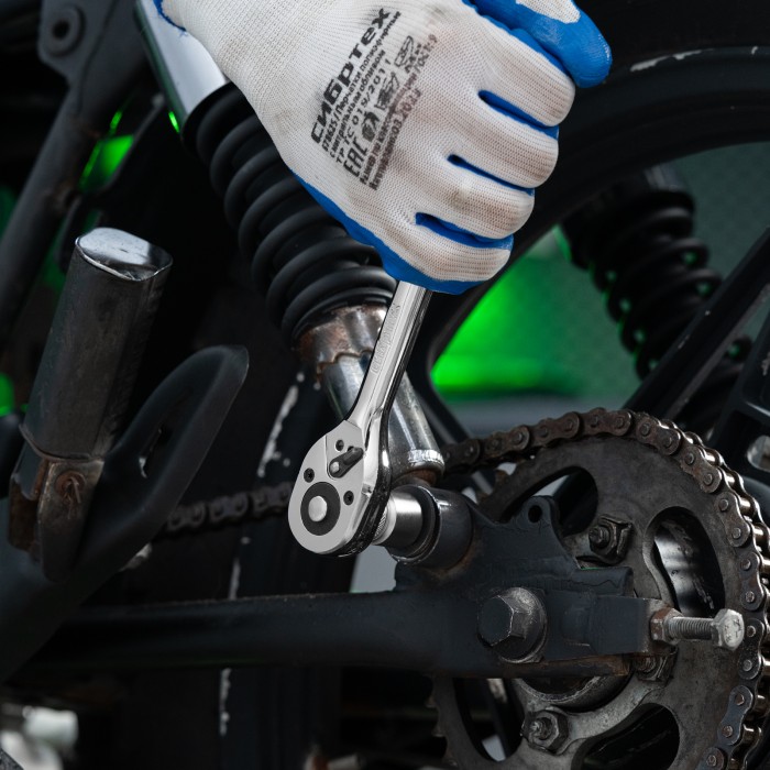 Хромированный ключ-трещотка Сибртех 14002 из стали CrV, с посадочным размером 3/8″ и 45-зубым храповым механизмом, с функцией быстрого сброса, используется для работы с резьбовым крепежом. Трещоточный механизм с 45 зубьями обеспечивает плавное вращение, облегчая работу. Инструмент пригодится дома, в мастерской и гараже.ПреимуществаПрочность — ключ изготовлен из закаленной хромованадиевой стали и выдерживает высокие нагрузки.Долговечность — зеркальное хромовое покрытие предотвращает образование коррозии.Эргономичность — рукоятка с нескользящей рельефной поверхностью надежно ложится в руку, поэтому работать инструментом комфортно.Функция реверса — при помощи переключателя с металлическим флажком можно одним движением изменить направление вращения трещотки.Надежная фиксация — шариковый замок крепко удерживает торцевую головку, поэтому она не соскочит во время работы.Быстрый сброс — достаточно нажать на кнопку, чтобы освободить головку от насадки, это особенно удобно для работы с крепежом разного размера.