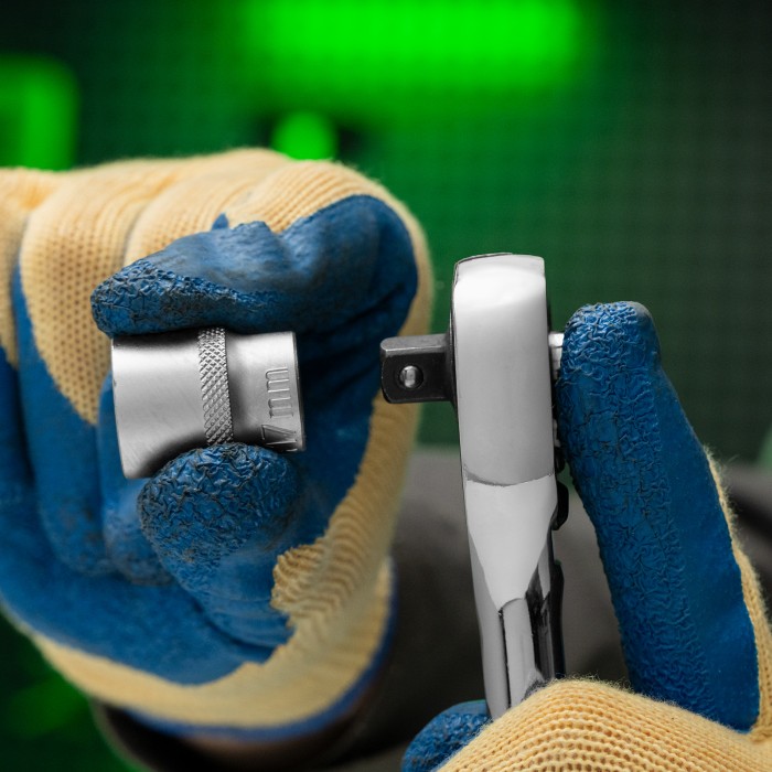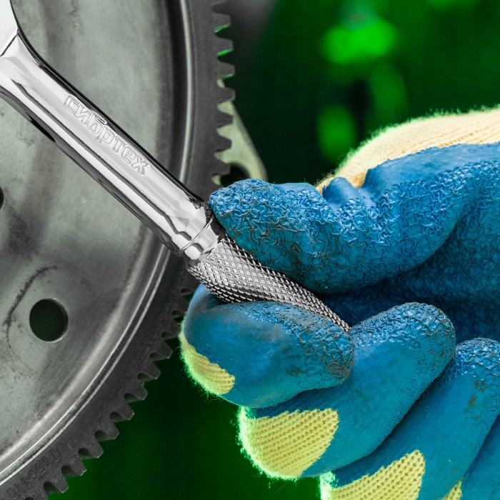 Цельнометаллический хромированный ключ-трещотка Сибртех 14018 из стали CrV, с посадочным размером 3/8″ и 45-зубым храповым механизмом, с функцией быстрого сброса, используется для монтажа и демонтажа резьбовых соединений. Предназначен для установки торцевых головок, адаптеров и удлинителей. Цельнометаллическая конструкция отличается повышенной прочностью, что позволяет работать со значительным усилием. Инструмент пригодится дома, в гараже и в поездке.ПреимуществаПрочность — ключ изготовлен из закаленной хромованадиевой стали и выдерживает высокие нагрузки.Долговечность — хромированная поверхность устойчива к образованию коррозии.Функция реверса — при помощи переключателя с металлическим флажком можно одним движением изменить направление вращения трещотки.Надежная фиксация — шариковый замок крепко удерживает торцевую головку, поэтому она не соскочит во время работы.Быстрый сброс — достаточно нажать на кнопку, чтобы освободить головку от насадки, это особенно удобно для работы с крепежом разного размера.