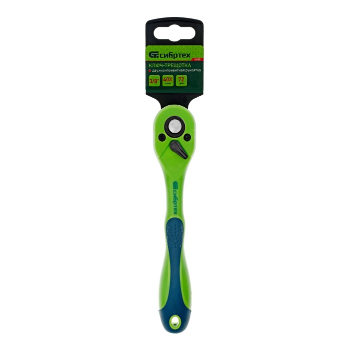 Ключ-трещотка Сибртех 14008 с двухкомпонентной рукояткой и присоединительным квадратом 3/8" используется с торцевыми головками, имеющими посадочное гнездо соответствующего размера. Предназначен для закручивания и раскруч...