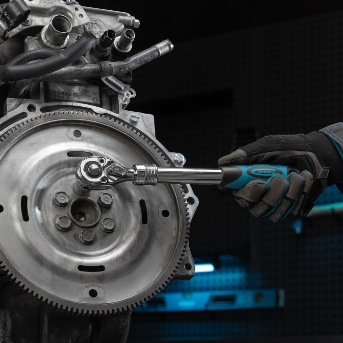 Телескопический хромированный трещоточный ключ Gross 14070, 305-445 мм, из стали CrV, с присоединительным квадратом 1/2 дюйма и 2-компонентной рукояткой, предназначен для монтажных работ с резьбовыми соединениями. Особенно удобен для работы в труднодоступных местах, т.к. имеет запатентованный механизм фиксации телескопической рукоятки. Ее длину можно изменить с 305 до 445 мм. Инструмент используется в слесарных мастерских, автосервисах, пригодится и в быту.ПреимуществаВысокая износостойкость — ключ-трещотка изготовлен из прочной стали хромованадиевой группы.Долговечность — хромированная поверхность устойчива к ржавчине и воздействию агрессивных веществ.Расширенные возможности — реверсивный механизм позволяет использовать инструмент как для закручивания, так и для откручивания крепежей.Легкая замена оснастки — кнопка быстрого сброса упрощает съем и установку насадок.Высокая плавность работы — храповой механизм с 72 зубцами имеет шаг 5 градусов.Надежная фиксация насадки — благодаря присоединительному квадрату с шариком оснастка не соскакивает во время работы.Комфортная эксплуатация — удобная двухкомпонентная ручка надежно ложится в руку и не выскальзывает из ладони.
