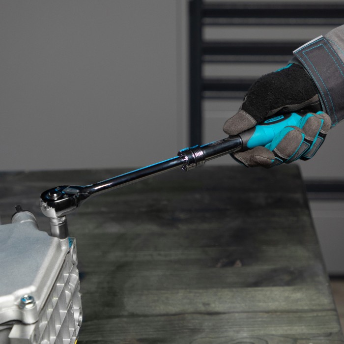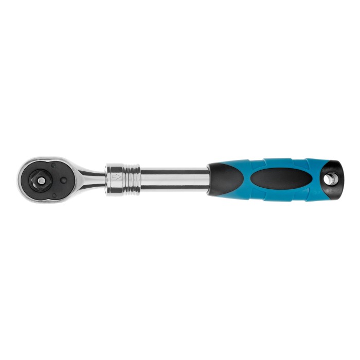 Телескопический хромированный трещоточный ключ Gross 14072, 215-315 мм, из стали CrV, с присоединительным квадратом 3/8 дюйма и 2-компонентной рукояткой, предназначен для монтажных работ с резьбовыми соединениями. Особенно удобен для работы в труднодоступных местах, т.к. имеет запатентованный механизм фиксации телескопической рукоятки. Ее длину можно изменить с 215 до 315 мм. Инструмент используется в слесарных мастерских, автосервисах, пригодится и в быту.ПреимуществаВысокая износостойкость — ключ-трещотка изготовлен из прочной стали хромованадиевой группы.Долговечность — хромированная поверхность устойчива к ржавчине и воздействию агрессивных веществ.Расширенные возможности — реверсивный механизм позволяет использовать инструмент как для закручивания, так и для откручивания крепежей.Легкая замена оснастки — кнопка быстрого сброса упрощает съем и установку насадок.Высокая плавность работы — храповой механизм с 72 зубцами имеет шаг 5 градусов.Надежная фиксация насадки — благодаря присоединительному квадрату с шариком оснастка не соскакивает во время работы.Комфортная эксплуатация — удобная двухкомпонентная ручка надежно ложится в руку и не выскальзывает из ладони.