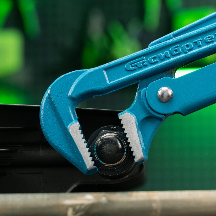 Кованый трубный рычажный ключ Сибртех №4 15762, тип «L», используется для захвата и вращения труб диаметром 3″, а также других деталей со специальным профилем и без него. Рычажный механизм увеличивает рабочее усилие, снижая нагрузку на руки мастера. Инструмент рассчитан на бытовое и профессиональное применение.ПреимуществаПрочность и долговечность — кованая конструкция из закаленной легированной стали устойчива к нагрузке кручения, губки закалены до твердости 48-52 HRC.Надежная фиксация — на регулировочном механизме с гайкой имеется стопорное кольцо.Прочный захват — зубья прогрессивной формы наклонены против направления вращения.Защита от коррозии — на инструмент нанесено порошковое покрытие.