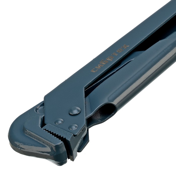 Кованый трубный рычажный ключ Сибртех №3 15772, тип «L», используется для захвата и вращения труб диаметром 2", а также других деталей со специальным профилем и без него. Рычажный механизм увеличивает рабочее усилие, снижая нагрузку на руки мастера. Инструмент рассчитан на бытовое и профессиональное применение.ПреимуществаПрочность и долговечность — кованая конструкция из закаленной легированной стали обеспечивает высокий рабочий ресурс, губки закалены до твердости 48-52 HRC.Надежная фиксация — на регулировочном механизме с гайкой имеется стопорное кольцо.Надежный захват — зубья прогрессивной формы наклонены против направления вращения.Защита от коррозии — на инструмент нанесено эмалированное покрытие.