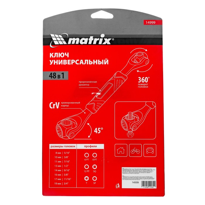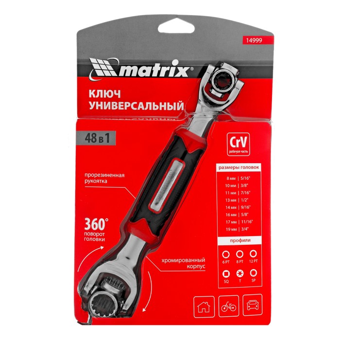 Ключ универсальный 48 в 1 Matrix 14999 из стали CrV имеет 8 размеров головок: 8 мм, 10 мм, 11 мм, 13 мм, 14 мм, 16 мм, 17 мм, 19 мм. Подходит для различных профилей: 6-гранных, 8-гранных, 12-гранных, Square, Torx, Spline...
