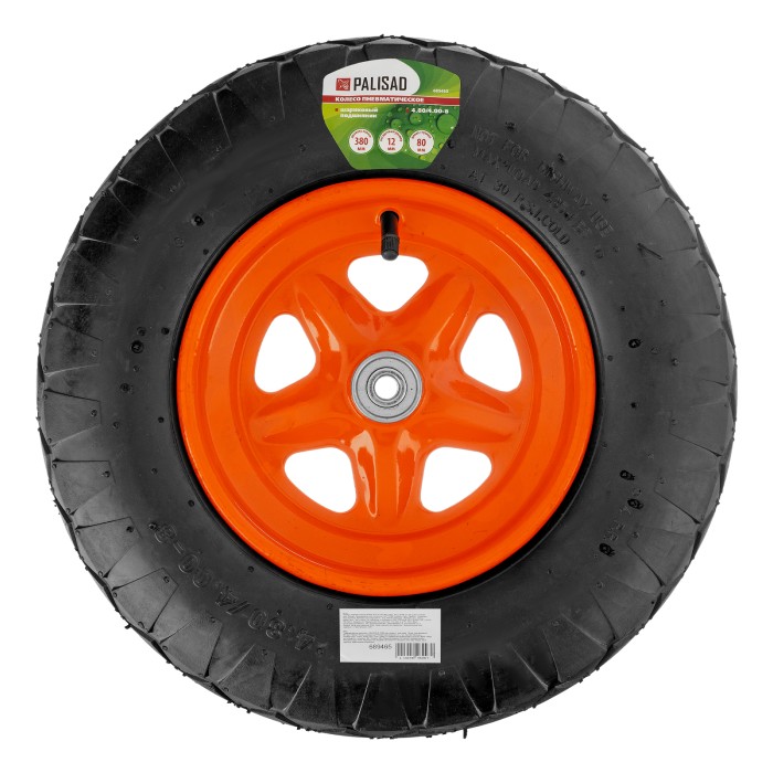 Пневматическое колесо 4,80/4,00-8 Palisad «Звезда» 689465 диаметром 380 мм имеет длину оси 80 мм и внутренний диаметр подшипника 12 мм, устанавливается на тачку Palisad 68912 для транспортировки грузов. Обладает хорошей проходимостью, а благодаря стальным подшипникам выдерживает нагрузки до 100 кг.ПреимуществаДолговечность — стальной диск со сплошным сварным швом и порошковым покрытием отличается прочностью и коррозионной стойкостью. Высокие показатели амортизации — пневмоколесо не вибрирует в процессе работы.Двухслойная покрышка с протектором — колесо устойчиво к повреждениям и обеспечивает маневренность тачки.Резиновая шина — колесо не издает шум и не царапает напольное покрытие во время работы в помещении.
