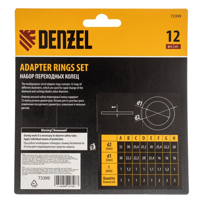 Переходные кольца Denzel 73399 диаметром 32 х 30, 30 х 25,4, 25,4 х 22,2, 22,2 х 20, 20 х 16, 30 х 22,2, 25,4 х 16, 22,2 х 16 мм предназначены для корректировки размера посадочного отверстия пильных и алмазных дисков. Используются для работы с циркулярными и торцовочными пилами. Комбинируя различные кольца из набора, можно добиться плотной посадки диска с любым посадочным диаметром.ПреимуществаНадежность и долговечность — основания изготовлены из стали 50 и оцинкованы для защиты от коррозии.Высокая точность изготовления — кольца обеспечивают простую установку оснастки на вал инструмента.Продуманная комплектация — в наборе 12 шт., кольца самых востребованных размеров поставляются по 2 шт.