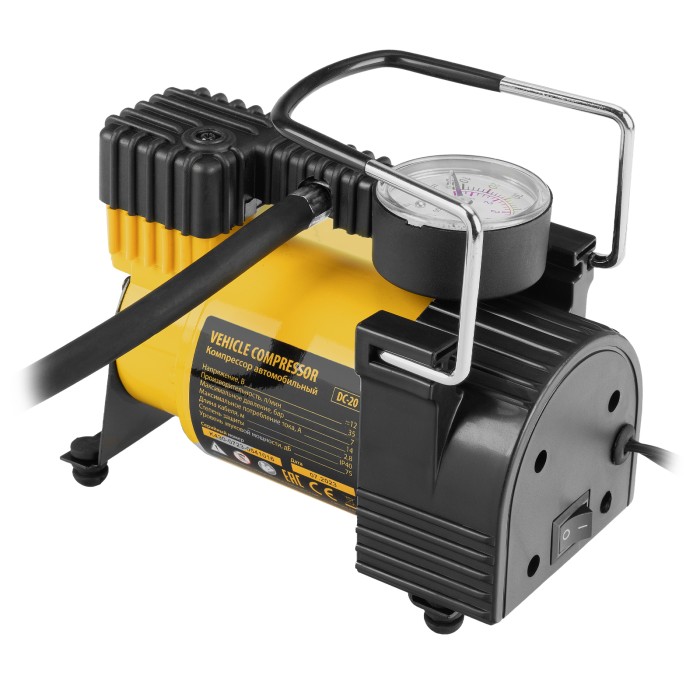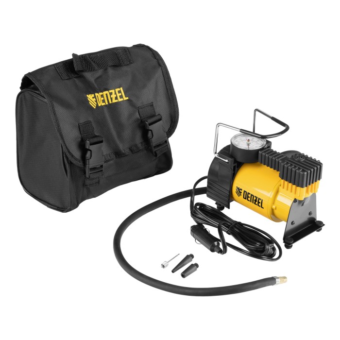 Автомобильный компрессор Denzel DC-20 58054 производительностью 35 л/мин работает от источника питания 12 В, создает давление 7 атмосфер и используется для быстрого накачивания шин автомобильных колес. Благодаря увеличенной мощности на подкачку колеса R16 потребуется не более 4-5 минут. Компрессор также подойдет для накачки мячей, надувных лодок, тюбингов и прочего снаряжения. Устройство не требует технического обслуживания и незаменимо в поездке или во время отдыха на природе.ПреимуществаКомпрессор оснащен манометром, что упрощает контроль давления и позволяет вовремя прекратить накачку.Прочный металлический корпус устойчив к механическим повреждениям.В комплект входит 3 насадки для подключения к ниппелям разных типов.Компрессор весит всего 2 кг и снабжен удобной ручкой для удобства перемещения.К компрессору прилагается сумка-чехол для хранения и транспортировки. Гарантия на заводской брак составляет 3 года, что подтверждает высокое качество компрессора.