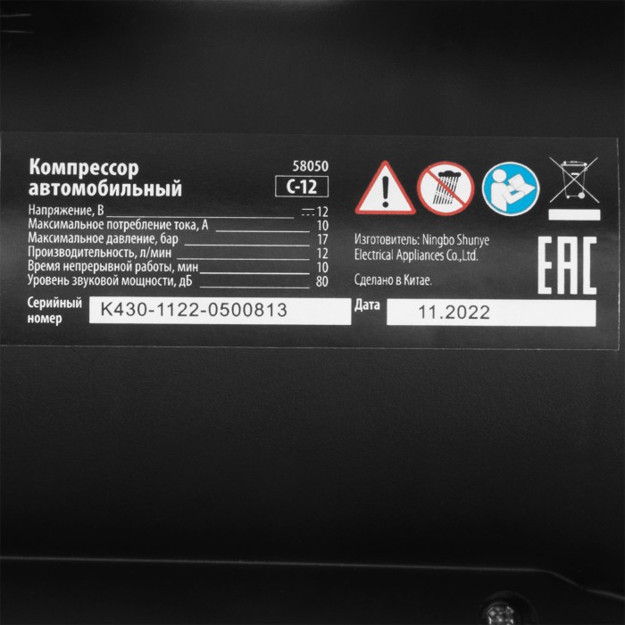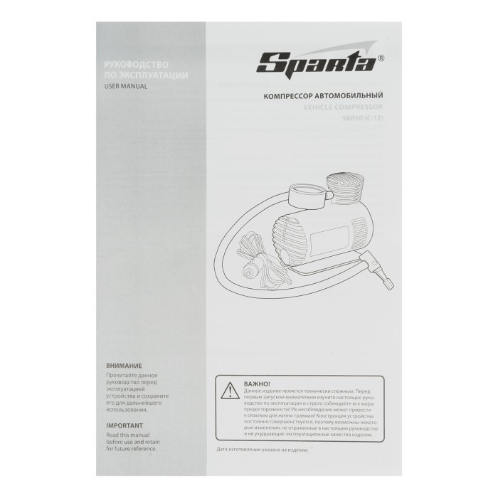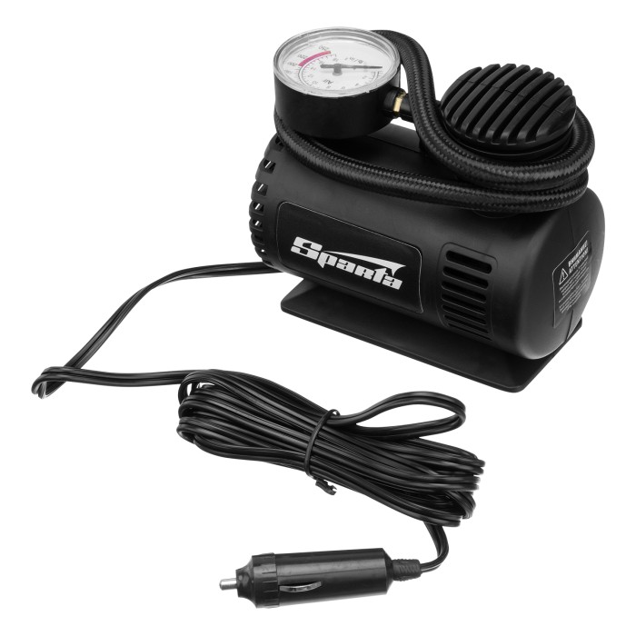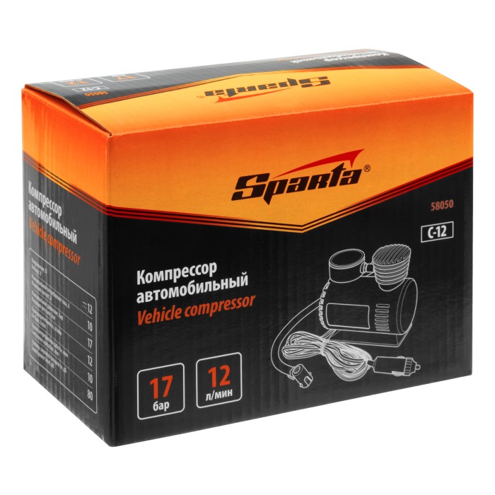 Автомобильный компрессор Sparta C-12 58050 производительностью 12 л/мин обеспечивает давление до 17 атмосфер и питается от прикуривателя 12 В. Используется для накачки шин, а также мячей, матрасов, лодок и другого инвентаря. Компрессор поршневого типа способен накачать колесо R16 за 10 минут. Устройство пригодится в поездке, на даче, во время отдыха на природе.ПреимуществаПростая эксплуатация — компрессор подключается к прикуривателю, а управление им не требует специальных навыков.Легкая подготовка к работе — быстросъемный коннектор шланга упрощает подсоединение компрессора.Контроль работы — на корпусе имеется манометр, отображающий давление в камере.Дополнительные возможности — в комплекте имеется 3 насадки для накачки предметов бытового назначения.Малый вес 0,6 кг — компактный компрессор легко транспортировать и хранить.