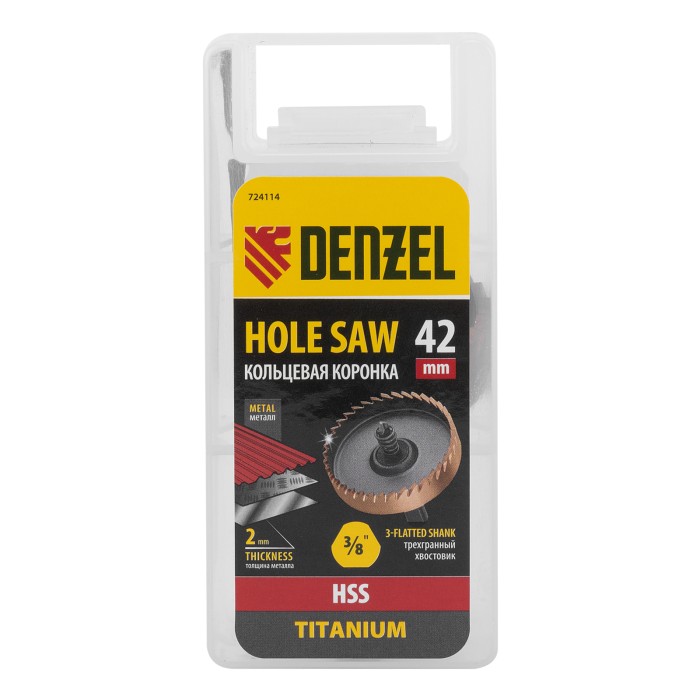 Коронка Denzel 724114 диаметром 42 мм, из стали HSS, с нитридтитановым покрытием, применяется для сверления отверстий в черных, цветных металлах, пластике и других материалах. Рассчитана на профессиональное использование...