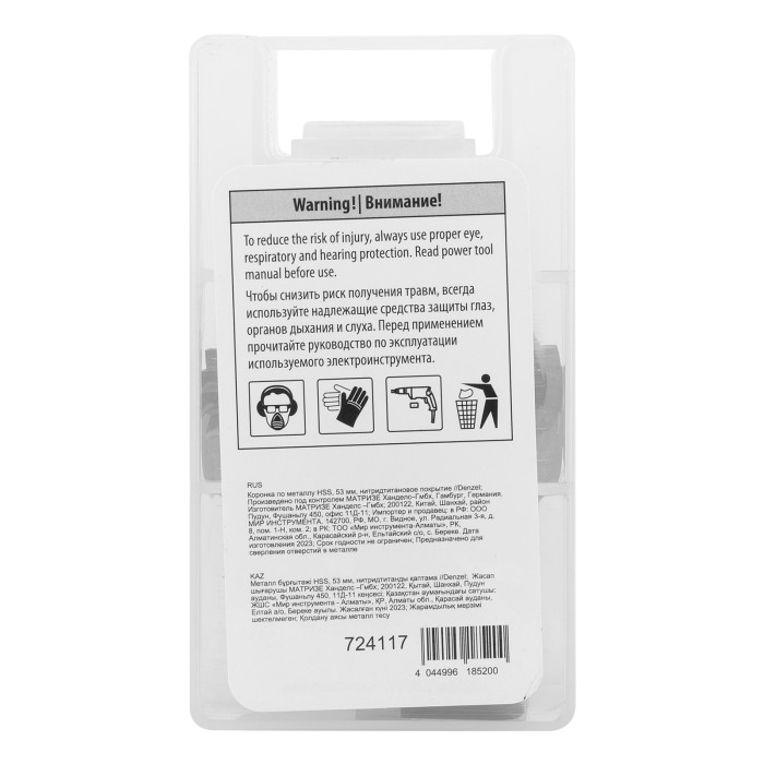 Коронка Denzel 724117 диаметром 53 мм, из стали HSS, с нитридтитановым покрытием, применяется для сверления отверстий в черных, цветных металлах, пластике и других материалах. Рассчитана на профессиональное использование на строительной площадке. Коронка пригодится при прокладке коммуникаций, монтаже оборудования, крепежных элементов и различных конструкций.ПреимуществаПрочность — корпус и рабочая часть являются монолитной конструкцией из высококачественной стали.Высокая эффективность — центрирующее сверло из быстрорежущей стали облегчает засверливание.Коррозионная стойкость — корпус и рабочая часть имеют защитное нитридтитановое покрытие.Эффективное удаление продуктов сверления — специальная пружина препятствует застреванию шлама.Трехгранный хвостовик — коронка не прокручивается в патроне перфоратора во время работы.