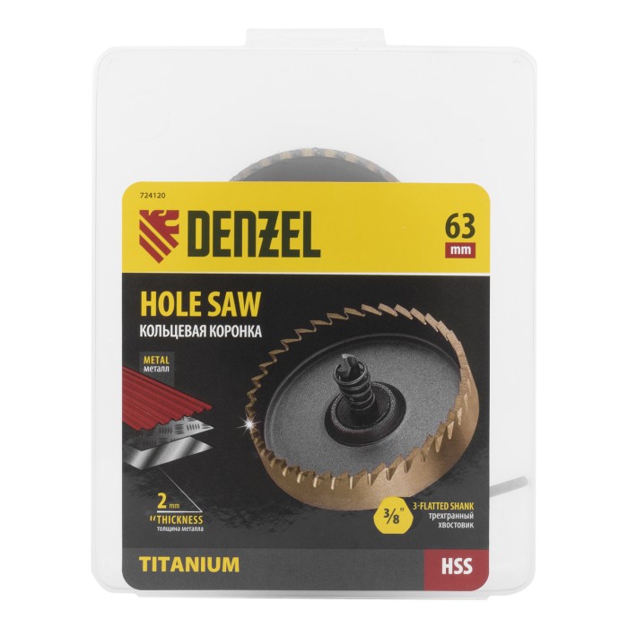 Коронка Denzel 724120 диаметром 63 мм, из стали HSS, с нитридтитановым покрытием, применяется для сверления отверстий в черных, цветных металлах, пластике и других материалах. Рассчитана на профессиональное использование...