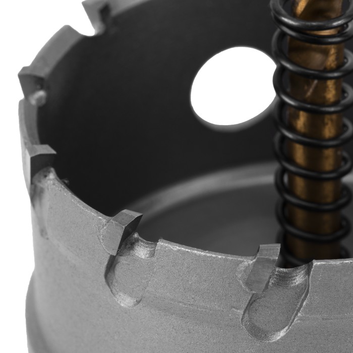 Твердосплавная коронка Denzel 724018 диаметром 64 мм используется для сверлильных работ по черным, цветным металлам, пластику и другим материалам. Позволяет получить отверстия большего диаметра в сравнении с обычным сверлом. Твердосплавные зубья легко выдерживают интенсивные нагрузки, поэтому коронка подходит не только для бытового, но и для профессионального применения.ПреимуществаПрочность — твердосплавные режущие пластины выполнены из сплава карбид-вольфрама, а корпус — из углеродистой стали.Эффективность — режущие пластины твердостью 91-92 HRC и центрирующее сверло из быстрорежущей легированной стали обеспечивают высокую скорость и качество засверливания.Высокая производительность — специальная пружина не допускает застревания шлама.Крепкая фиксация — трехгранный хвостовик не прокручивается в патроне.Надежность — коронка изготовлена на современном оборудовании методом электросварки.