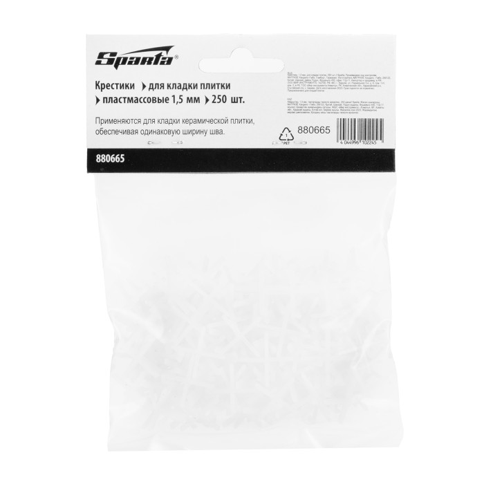 Крестики для кладки плитки Sparta 880665 толщиной 1,5 мм, 250 шт. в упаковке, позволяют добиться одинакового межплиточного расстояния в ходе облицовочных работ. Облегчают укладку плиточного покрытия и обеспечивают ему эстетичный внешний вид.ПреимуществаИзносостойкость — крестики изготовлены из пластмассы, устойчивой к химическим и механическим воздействиям.Удобная эксплуатация — крестики не прилипают к плитке и легко извлекаются из швов.Возможность многократного использования — изделия легко отмываются от клея простой водой.Продуманная комплектация — 250 штук хватит для укладки минимум 30 плиток.