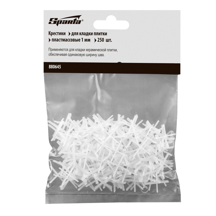 Крестики для кладки плитки Sparta 880645 толщиной 1,0 мм, 250 шт. в упаковке, позволяют добиться одинакового межплиточного расстояния в ходе облицовочных работ. Облегчают укладку плиточного покрытия и обеспечивают ему эстетичный внешний вид.ПреимуществаИзносостойкость — крестики изготовлены из пластмассы, устойчивой к химическим и механическим воздействиям.Удобная эксплуатация — крестики не прилипают к плитке и легко извлекаются из швов.Возможность многократного использования — изделия легко отмываются от клея простой водой.Продуманная комплектация — 250 штук хватит для укладки минимум 30 плиток.