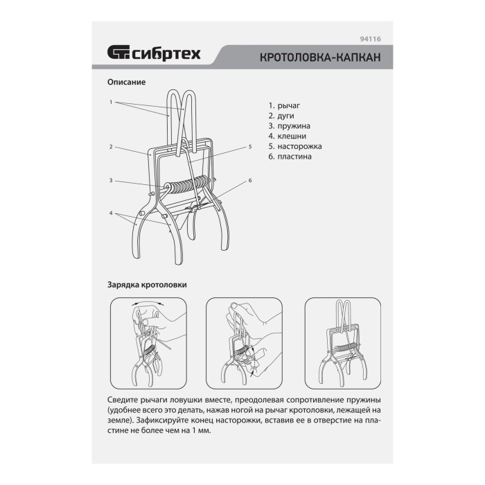 Плунжерная оцинкованная кротоловка-капкан Сибртех 94116 используется для борьбы с кротами на дачном участке. Кротоловка быстро устанавливается в вырытые животными норы и тоннели, механизм с усиленной пружиной обеспечивае...