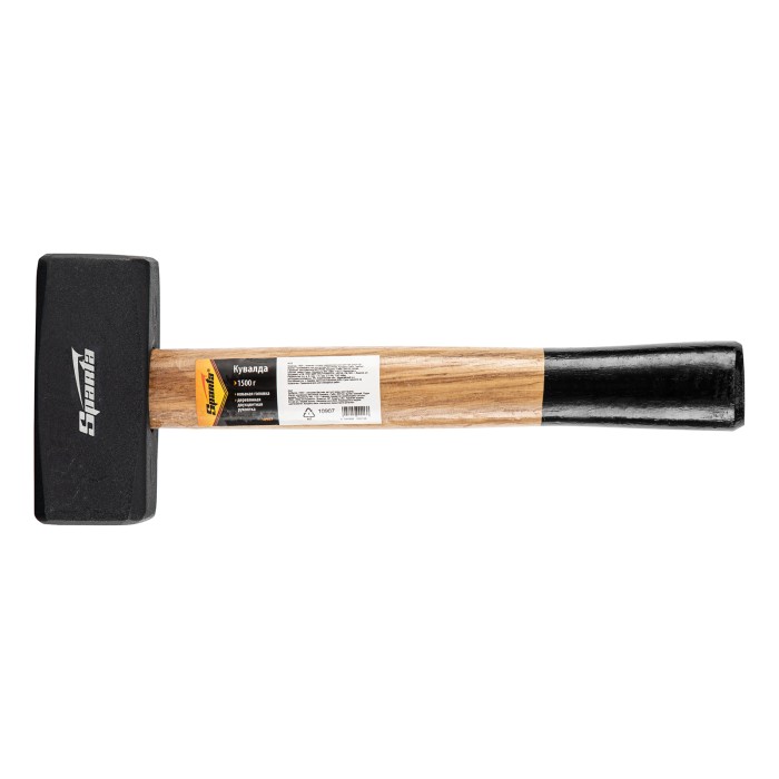 Кувалда Sparta 10907 длиной 310 мм, с бойком весом 1500 г, кованой головкой и деревянной двухцветной рукояткой, — ударный инструмент, которым можно наносить аккуратные контролируемые удары, чтобы выправить форму детали, забить большой гвоздь или скобу. Слегка выпуклый боек, изготовленный методом ковки и отшлифованный с двух сторон, отличается надежностью. Кувалда используется в быту для проведения строительных работ и ремонта автомобилей.ПреимуществаДеформационная стойкость — боек из среднеуглеродистой стали 45, закаленной токами высокой частоты до твердости 40-45 HRC, не расколется и не расплющится при ударе о металл.Безопасная работа — с граней ударных поверхностей сняты фаски, что предотвращает откалывание мелких частиц во время работы.Устойчивость к разрушению — лакированная деревянная рукоять не рассыхается, голова кувалды покрыта черным лаком для защиты от коррозии.Надежная фиксация бойка — рукоятка расклинена в голове и залита смолой.Комфортная работа —деревянная рукоять не выскальзывает из ладони.
