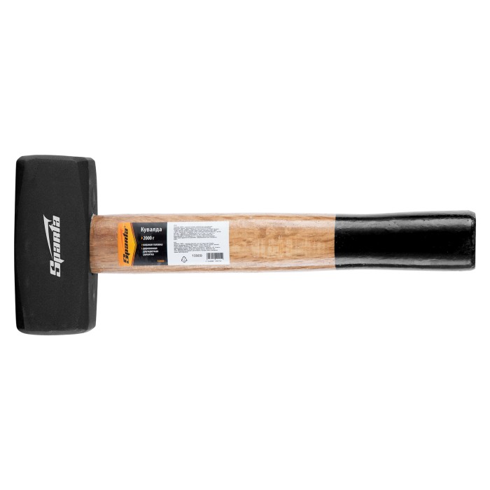 Кувалда Sparta 10909 длиной 300 мм, с бойком весом 2000 г, кованой головкой и деревянной двухцветной рукояткой, — ударный инструмент, которым можно наносить аккуратные контролируемые удары, чтобы выправить форму детали, забить большой гвоздь или скобу. Слегка выпуклый боек, изготовленный методом ковки и отшлифованный с двух сторон, отличается надежностью. Кувалда используется в быту для проведения строительных работ и ремонта автомобилей.ПреимуществаДеформационная стойкость — боек из среднеуглеродистой стали 45, закаленной токами высокой частоты до твердости 40-45 HRC, не расколется и не расплющится при ударе о металл.Безопасная работа — с граней ударных поверхностей сняты фаски, что предотвращает откалывание мелких частиц во время работы.Устойчивость к разрушению — лакированная деревянная рукоять не рассыхается, голова кувалды покрыта черным лаком для защиты от коррозии.Надежная фиксация бойка — рукоятка расклинена в голове и залита смолой.Комфортная работа —деревянная рукоять не выскальзывает из ладони.