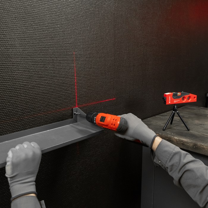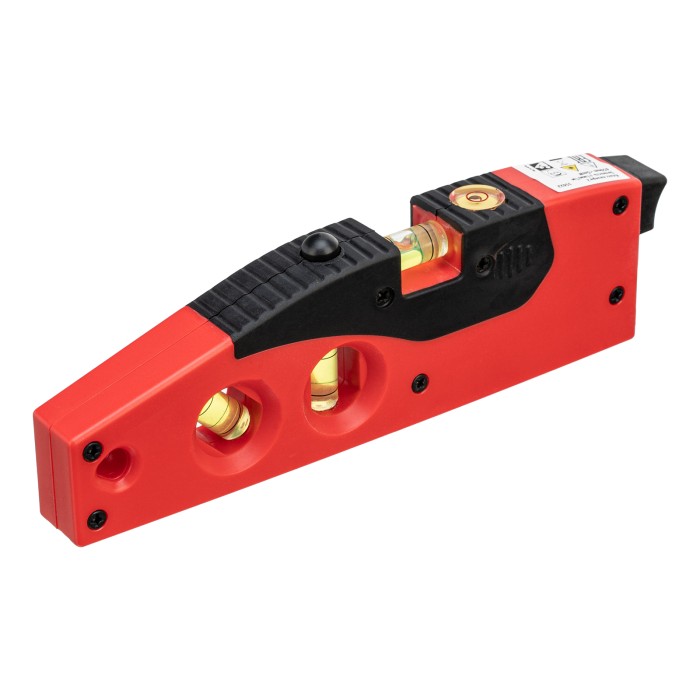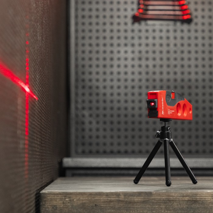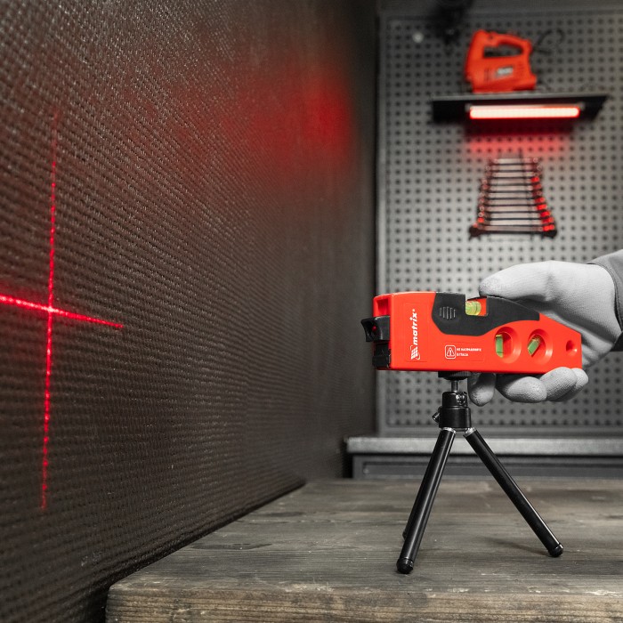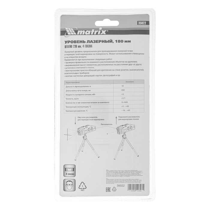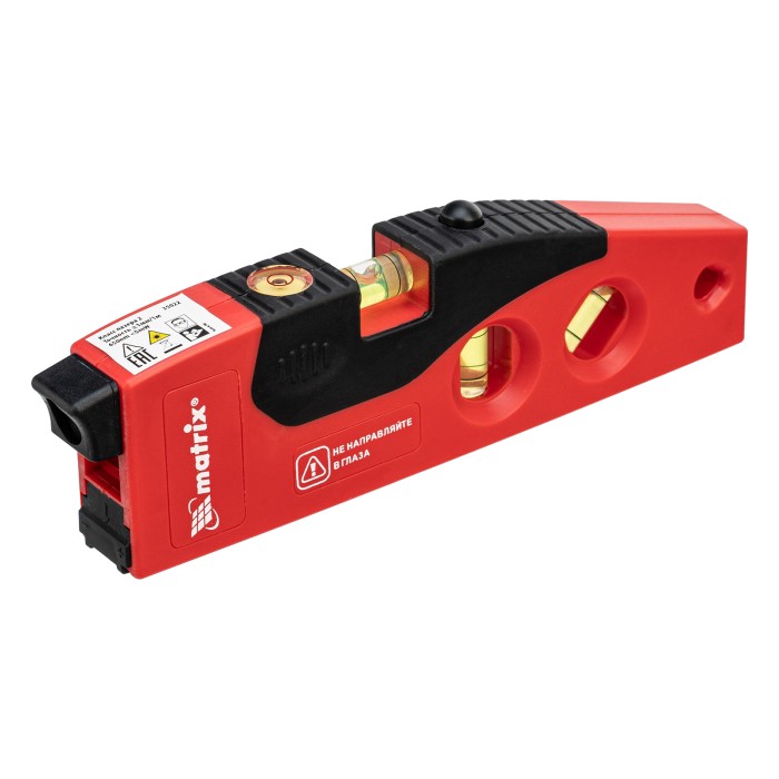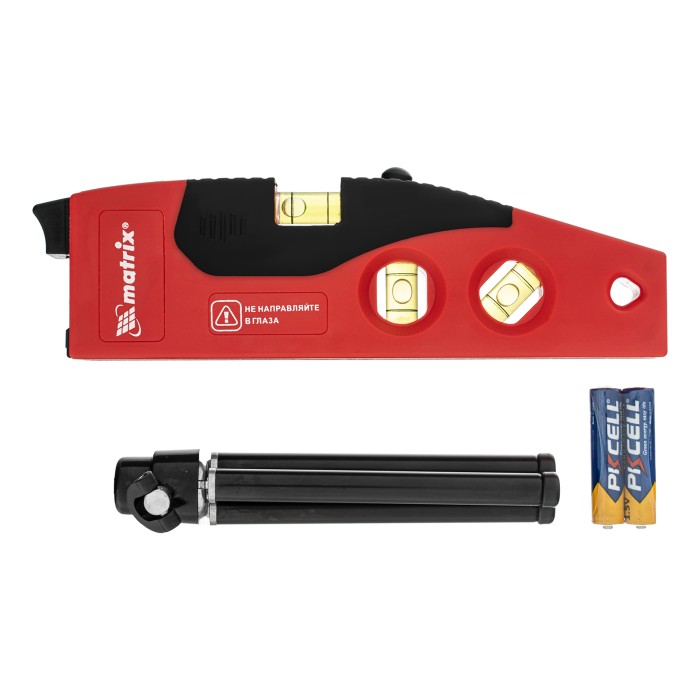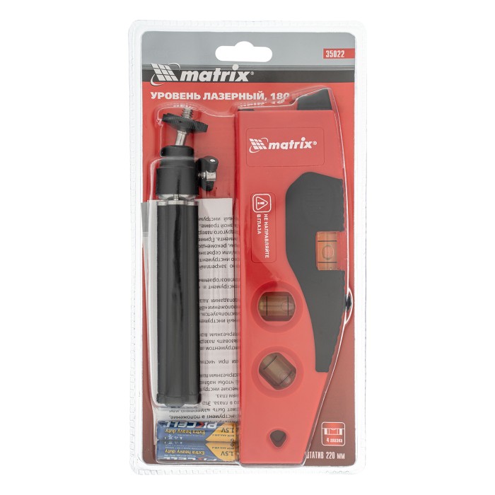 Лазерный уровень Matrix 35022 длиной 180 мм, с 4 глазками и штативом 220 мм, используется для построения разметки во время ремонта и строительства. Позволяет с высокой точностью выполнить установку подвесной мебели, монтаж розеток, выключателей и электроприборов, укладку облицовочной плитки на пол и стены. Дальность проецирования составляет 10 м. Красный цвет луча виден при любом освещении, поэтому уровень подходит для использования как в помещениях, так и на открытом воздухе.ПреимуществУдобное использование — штатив высотой 22 см, с диаметром ножек 9 мм, обеспечивает устойчивость инструмента и позволяет работать в одиночку.Точное позиционирование — в корпус встроены 4 глазка: вертикальный, горизонтальный, круговой и наклонный (45°).Фиксация на металлических поверхностях — производитель предусмотрел магнитное крепление.Готовность к эксплуатации — в комплект поставки входит 2 батарейки типа ААА, поэтому приступать к работе можно сразу после покупки.Удобное хранение и транспортировка — уровень весит 213 г, его габариты составляют 24 х 12,7 х 3 см.