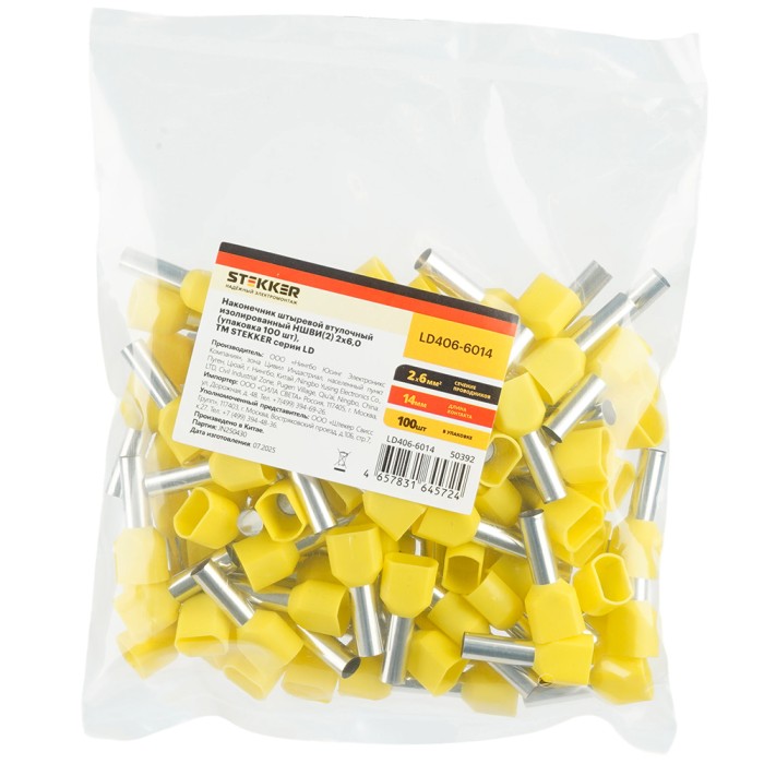 LD406-6014 Наконечник штыревой втулочный изолированный НШВИ(2) 6,0-14 (упаковка 100 шт) 50392