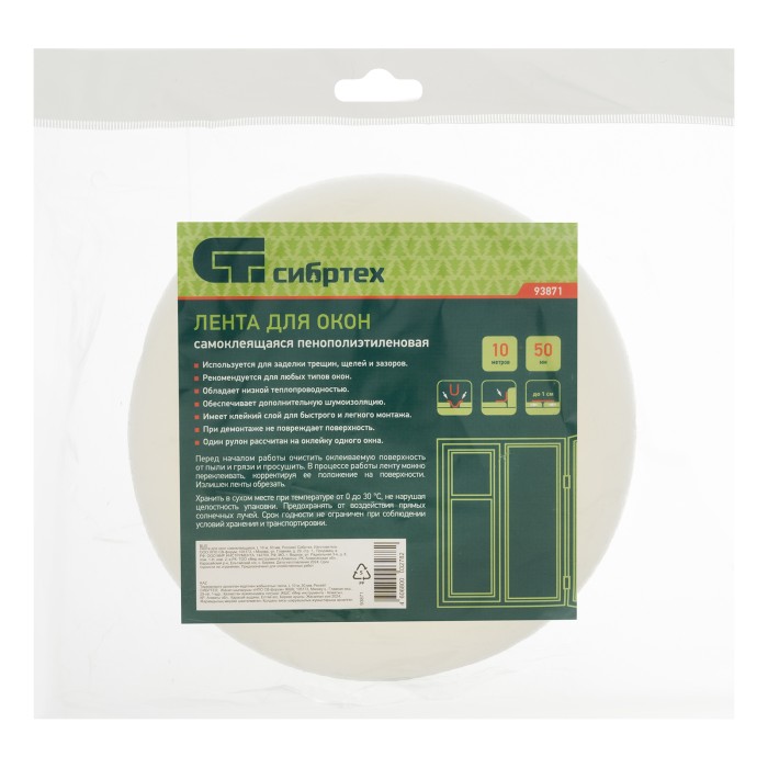 Самоклеящаяся лента для окон и дверей Сибртех 93871 шириной 50 мм и длиной 10 м используется для тепло- и звукоизоляции квартиры, офиса, магазина и других помещений. Позволяет предотвратить образование сквозняков, попадание пыли и грязи.ПреимуществаВысокие адгезивные свойства — лента надежно фиксируется на металлических, пластиковых и деревянных поверхностях.Влагостойкость — уплотнитель практически не подвержен гниению и плесени, не отклеивается при попадании воды.Эластичность — утеплитель легко меняет и восстанавливает форму, не мешая окнам закрываться и открываться.Неприхотливость — уплотнитель сохраняет свои свойства при температуре от -50 до +45 °C.Экономичность — изделие выполнено из недорогого, но качественного материала — пенополиэтилена.Простая установка — лента быстро приклеивается и отклеивается без дополнительных инструментов.