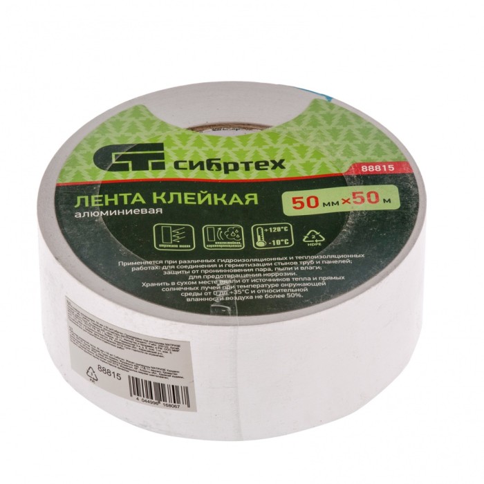 Алюминиевая клейкая лента Сибртех 88815 размером 50 мм х 50 м применяется для проведения работ по установке вентиляционных систем и систем кондиционирования воздуха. Пригодится для выполнения ремонта, гидро- и теплоизоляции в быту и на строительной площадке. Лента отлично удерживает тепло, устойчива к низким температурам, поэтому надежно защитит стыки и швы металлических деталей от грязи, пыли, плесени, коррозии и т.д.ПреимуществаДолговечность — основа из алюминиевой фольги устойчива к повреждениям и воздействию влаги и ультрафиолета.Надежная фиксация — клеевой слой на основе синтетического каучука обеспечивает высокую адгезию ленты к любым поверхностям.Экологичность — алюминиевая лента на картонно-бумажной втулке не выделяет токсичных веществ при нагревании и утилизации, поэтому безвредна для человека и окружающей среды.Длина 50 м — намотки хватит надолго даже при интенсивном использовании.
