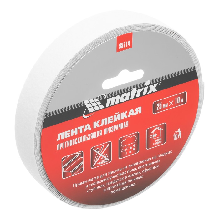 Клейкая противоскользящая лента Matrix 88714, прозрачная, шириной 25 мм и длиной 10 м, позволяет снизить риск получения травм на лестницах, кафеле и других скользких поверхностях. Пригодится в помещениях с большой посещаемостью: общественных зданиях, многоквартирных домах, бассейнах и др. Благодаря прочному клеевому составу лента крепится на любые поверхности: ламинат, кафель и т. д. Ленту следует монтировать при температуре выше +12 ℃ на предварительно очищенную сухую поверхность.ПреимуществаЭффективность — абразивное покрытие из оксида алюминия устойчиво к истиранию и обеспечивает высокую степень защиты.Простая эксплуатация — лента быстро наклеивается и снимается, не повреждая поверхность.Защита от повреждения — на стороне с клейкой основой предусмотрена специальная лента.Высокий ресурс — основа ленты устойчива к перепадам температуры, механическим нагрузкам и воздействию химических веществ.Универсальность — изделие сохраняет рабочие свойства при температуре от -25 до 80 °C и может использоваться как внутри помещения, так и снаружи.Прозрачность — лента не выделяется на поверхности, поэтому подойдет для любого интерьера.Экологичность — утилизация картонно-бумажной втулки не вредит окружающей среде.Ширина 25 мм — лента оптимальна для оклеивания участков небольшой площади.