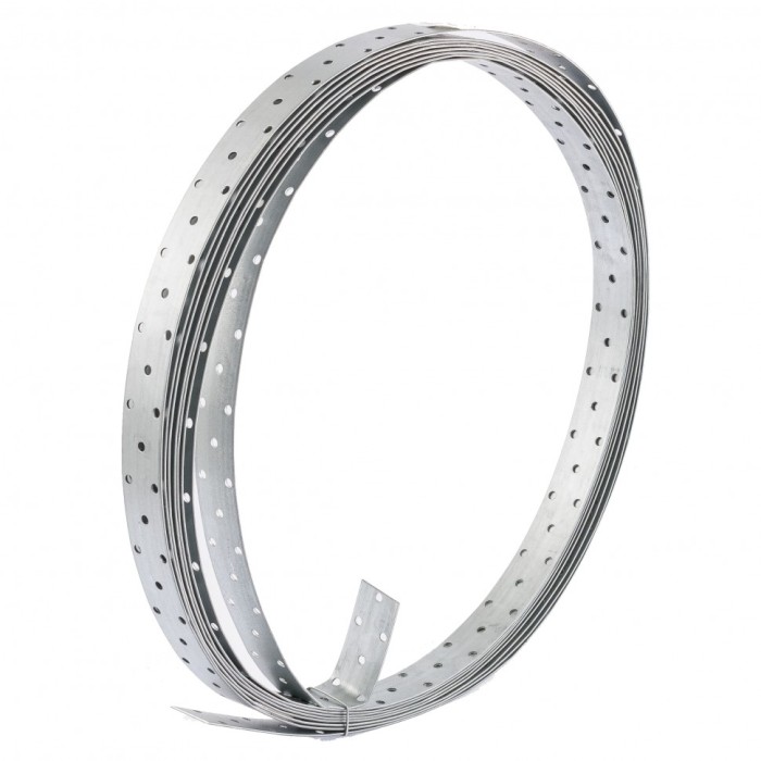 Перфорированная монтажная лента Сибртех 46580 с покрытием из цинка, толщиной 1,5 мм, шириной 3 см и длиной 10 м, с отверстиями диаметром 4,5-5 мм, предназначена для скрепления или усиления элементов строительных конструк...