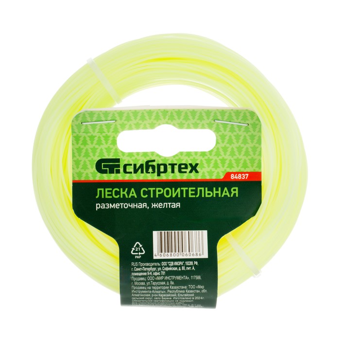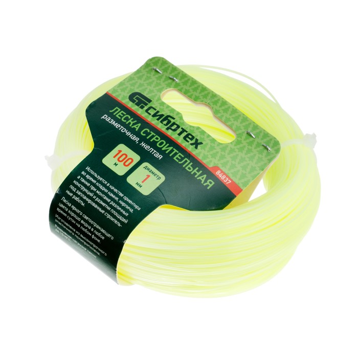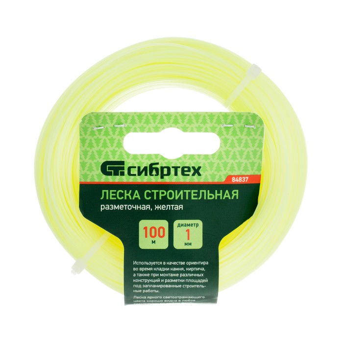 Леска строительная Сибртех 84837, длина 100 м, диаметр 1 мм, желтого цвета, пригодится на строительной площадке как ориентир при укладке материалов, установке конструкций. Также она будет полезна для садоводов для размет...