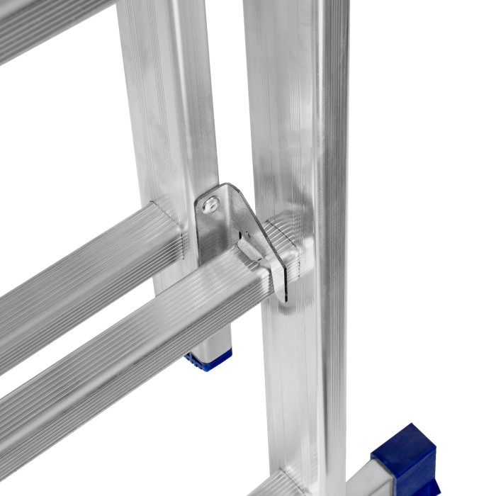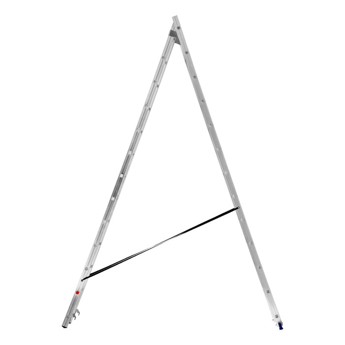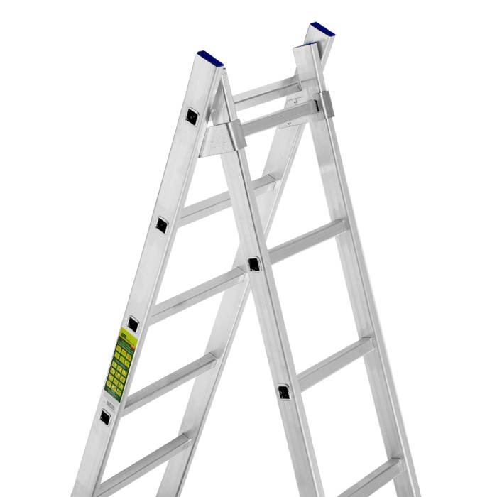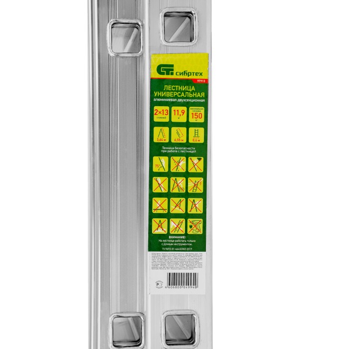 Алюминиевая двухсекционная лестница Сибртех 97913 состоит из 2 секций по 13 ступеней каждая. Легкая и прочная, она используется в качестве двухсторонней стремянки, предназначена для бытового и полупрофессионального применения.Преимущества3 рабочих положения — стремянка, двухсторонняя стремянка, приставная лестница с одной или двумя секциями.Надежность — рама, изготовленная из алюминиевого профиля прямоугольного сечения методом прессования, выдерживает нагрузку до 150 кг, страховочные стяжки увеличивают прочность конструкции.Устойчивость — благодаря съемному стабилизатору лестница ровно стоит на горизонтальной поверхности.Защита напольного покрытия — пластиковые заглушки на ножках предотвращают появление царапин.Безопасность пользователя — на профилированных ступенях имеется противоскользящее рифление, также предусмотрены ограничители безопасности по максимальной высоте.Простая и компактная конструкция — лестница быстро собирается и разбирается, не занимает много места при хранении и транспортировке.Внешний вид товара может незначительно отличаться от указанного на изображении, что не влечет изменения его качества.