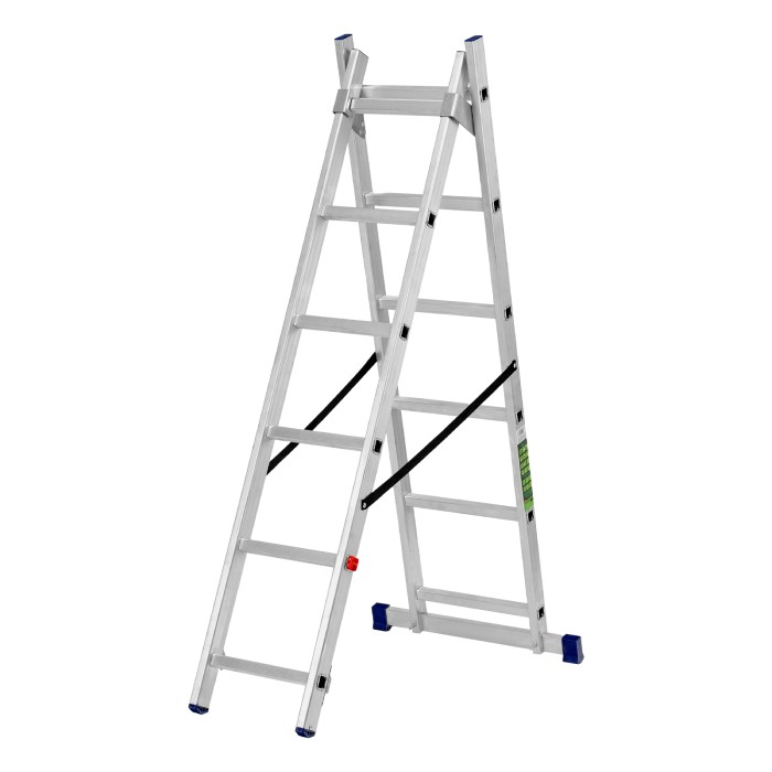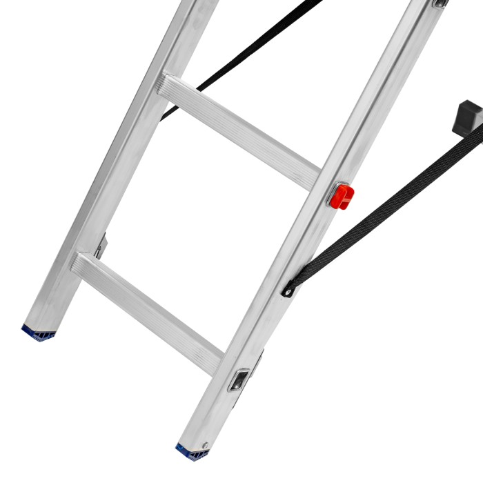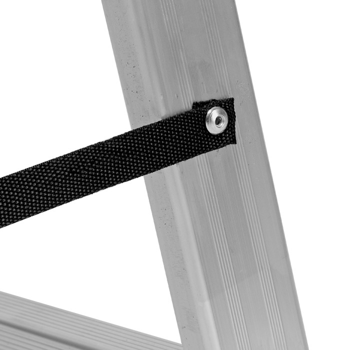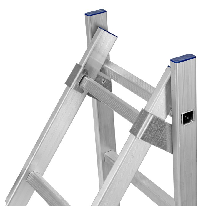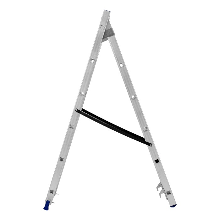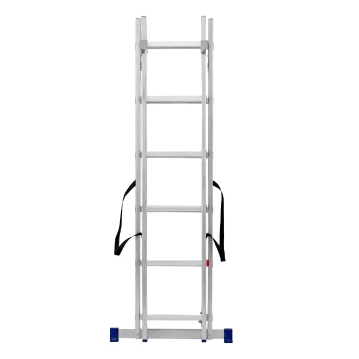 Алюминиевая двухсекционная лестница Сибртех 97906 состоит из 2-х секций по 6 ступеней каждая. Легкая и прочная, она используется в качестве двухсторонней стремянки, предназначена для бытового и полупрофессионального применения.Преимущества3 рабочих положения — стремянка, двухсторонняя стремянка, приставная лестница с одной или двумя секциями.Надежность — рама, изготовленная из алюминиевого профиля прямоугольного сечения методом прессования, выдерживает нагрузку до 150 кг, страховочные стяжки увеличивают прочность конструкции.Устойчивость — благодаря съемному стабилизатору лестница ровно стоит на горизонтальной поверхности.Защита напольного покрытия — пластиковые заглушки на ножках предотвращают появление царапин.Безопасность пользователя — на профилированных ступенях имеется противоскользящее рифление, также предусмотрены ограничители безопасности по максимальной высоте.Простая и компактная конструкция — лестница быстро собирается и разбирается, не занимает много места при хранении и транспортировке.Внешний вид товара может незначительно отличаться от указанного на изображении, что не влечет изменения его качества.