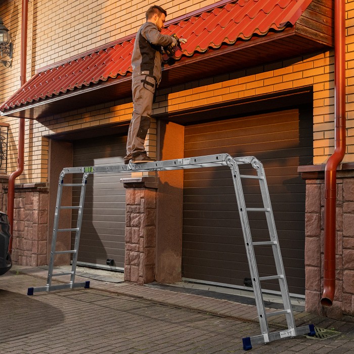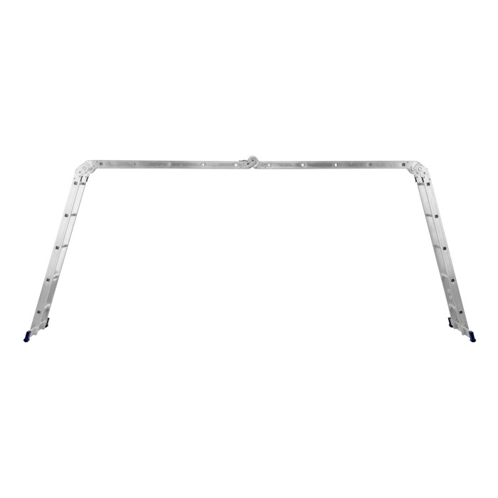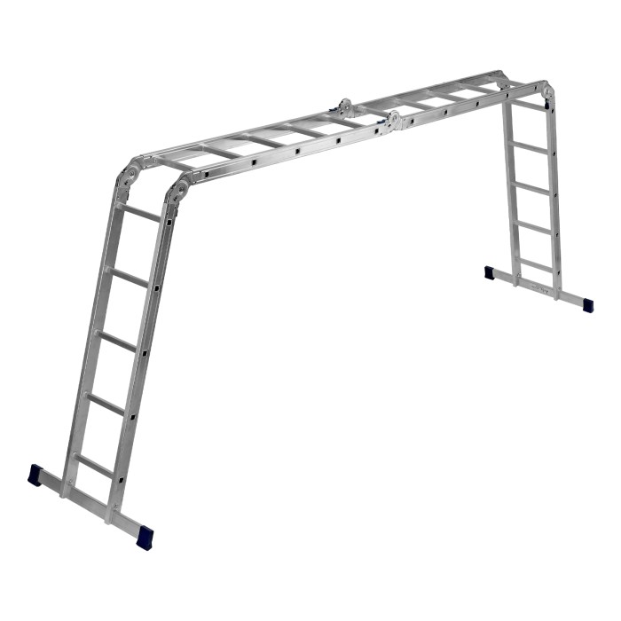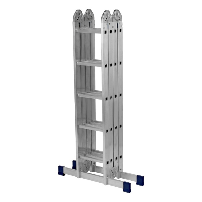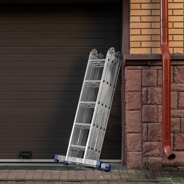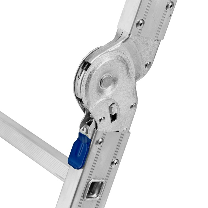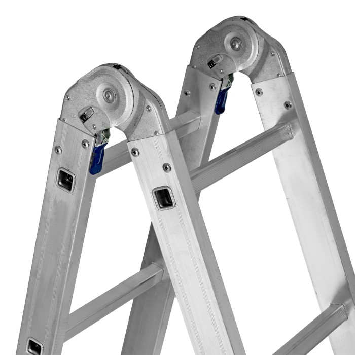 Шарнирная алюминиевая лестница Сибртех 97883 представляет собой 4 секции по 5 ступеней, которые можно настроить в нескольких рабочих положениях. Она может использоваться в качестве приставной лестницы, двухсторонней стремянки и помоста. Будет полезна как в быту, так и на небольших стройках, в гараже и магазинах.ПреимуществаШирокие траверсы — лестница устойчиво фиксируется на горизонтальной поверхности в любом рабочем положении.Противоскользящее рифление на ступенях — пользоваться лестницей безопасно, нога не соскользнет в процессе выполнения работ.Сочетание легкости и прочности — рама изготовлена из прессованного алюминиевого профиля прямоугольного сечения, выдерживает нагрузку до 120 кг.Надежные шарнирные механизмы — лестница не шатается в рабочих положениях, смена рабочих положений происходит быстро и легко.