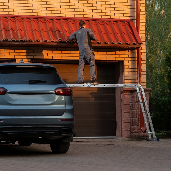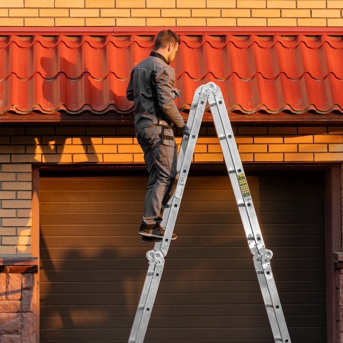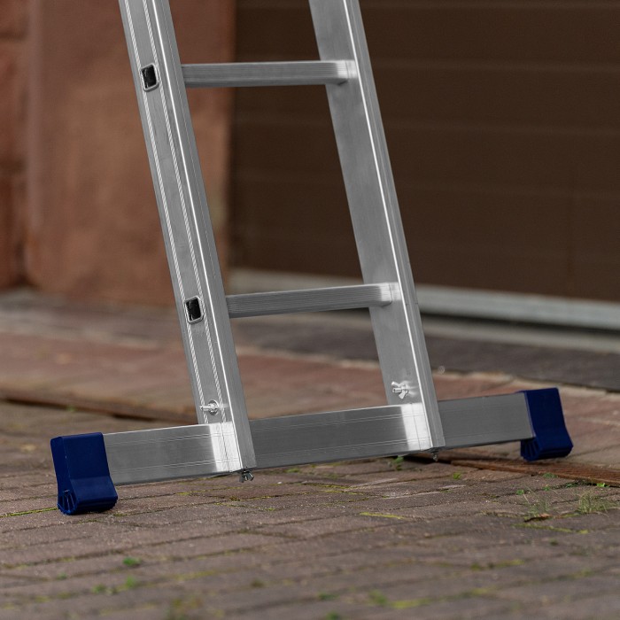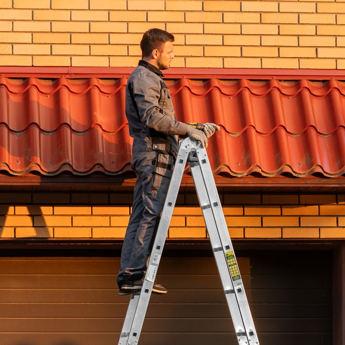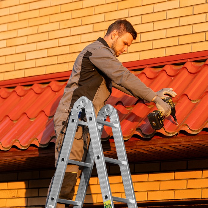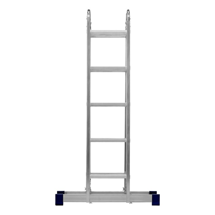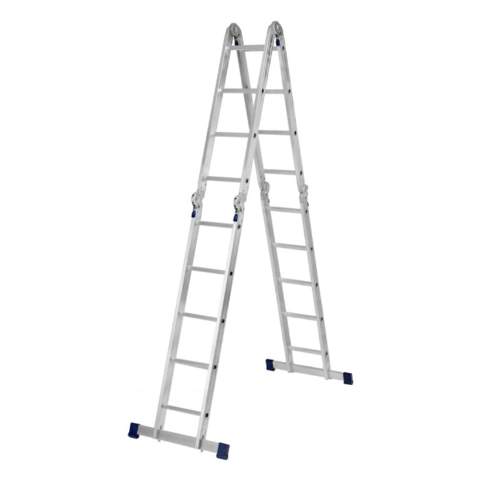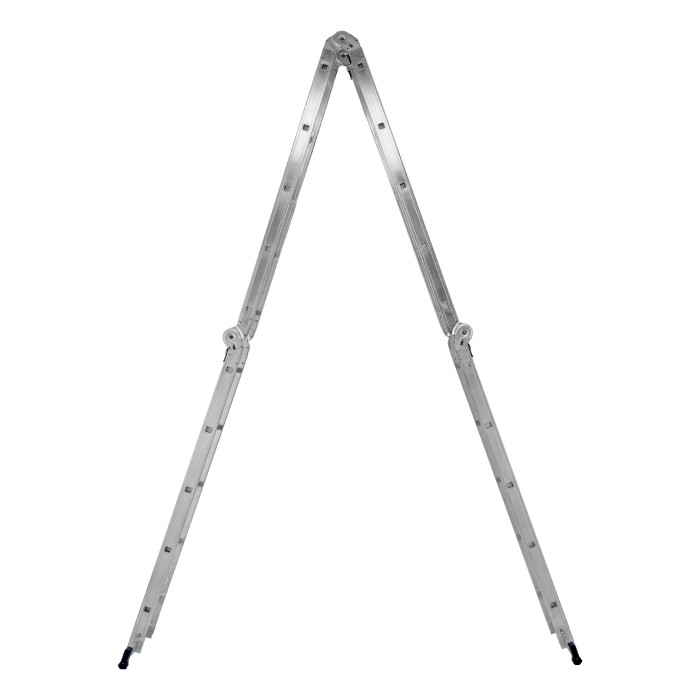 Шарнирная алюминиевая лестница Сибртех 97883 представляет собой 4 секции по 5 ступеней, которые можно настроить в нескольких рабочих положениях. Она может использоваться в качестве приставной лестницы, двухсторонней стремянки и помоста. Будет полезна как в быту, так и на небольших стройках, в гараже и магазинах.ПреимуществаШирокие траверсы — лестница устойчиво фиксируется на горизонтальной поверхности в любом рабочем положении.Противоскользящее рифление на ступенях — пользоваться лестницей безопасно, нога не соскользнет в процессе выполнения работ.Сочетание легкости и прочности — рама изготовлена из прессованного алюминиевого профиля прямоугольного сечения, выдерживает нагрузку до 120 кг.Надежные шарнирные механизмы — лестница не шатается в рабочих положениях, смена рабочих положений происходит быстро и легко.