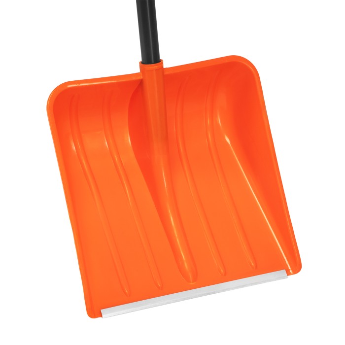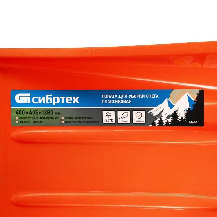 Пластиковая лопата Сибртех 61666 размером 400 х 405 х 1380 мм, со стальным черенком, используется для уборки снега на занесенных дорожках, тротуарах, подъездных путях. Вместительный усиленный ковш с высокими бортиками позволяет быстро справиться с работой.ПреимуществаНадежность — рабочая плоскость, усиленная ребрами жесткости, выдерживает повышенные нагрузки без риска излома.Высокий ресурс — ковш из морозостойкого полипропилена сохраняет рабочие свойства при температуре до -30 °C.Устойчивость к истиранию — кромка ковша защищена алюминиевой окантовкой, которая легко проникает в плотный снег и наст.Защита от механических воздействий и коррозии — алюминиевая накладка покрыта порошковой эмалью.
