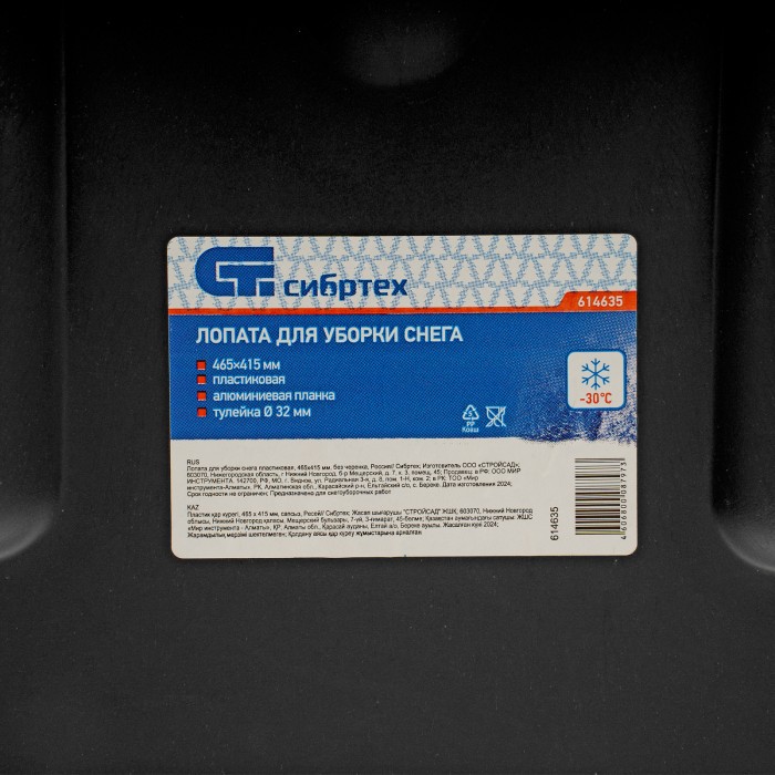 Пластиковая лопата Сибртех 614635 размером 405 х 415 мм, без черенка, предназначена для уборки снега. Поможет расчистить тротуар, садовую дорожку, площадку перед подъездом или гаражом. Глубокий ковш с высокими бортиками захватывает много снега, что ускоряет и упрощает уборку. Черенок приобретается отдельно, рекомендуемые артикулы: 68412, 68409, 68408.ПреимуществаПрочность — ковш усилен ребрами жесткости, поэтому не сломается при интенсивном использовании.Морозостойкость — лопата из ударопрочного полипропилена выдерживает температуру до -50 градусов.Эффективность и долговечность — алюминиевая накладка на кромке ковша позволяет справляться со слежавшимся снегом и настом, а также предотвращает преждевременный износ инструмента.