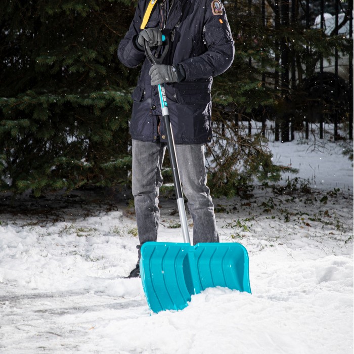 Пластиковая лопата Palisad LUXE 615685, 540 х 375 х 1420 мм, со стальным черенком, используется для уборки снега. С ее помощью можно освободить от снежных заносов дорожки, тротуары, подъездные пути к дому или гаражу. Ковш изготовлен из полипропилена и выдерживает мороз до -50 градусов. Лопата весит всего 2,25 кг, поэтому работа с ней долго не вызывает усталости. Глубокий ковш с высокими бортиками позволяет захватывать много снега, сокращая время уборки. Инструмент пригодится для расчистки городских дворов, скверов, площадок перед гаражами, дачных участков.ПреимуществаК ковшу из полипропилена не прилипает снег, что упрощает работу.Окантовка из оцинкованной стали защищает кромку ковша от износа и облегчает уборку слежавшегося снега и наста.Ребра жесткости увеличивают прочность ковша на изгиб при захвате большого количества снега.Стальной черенок с покрытием из порошковой эмали устойчив к коррозии и долговечен.Накладка из ПВХ на черенке обеспечивает надежный хват.Дополнительная обрезиненная рукоятка уменьшает усталость при длительной работе.